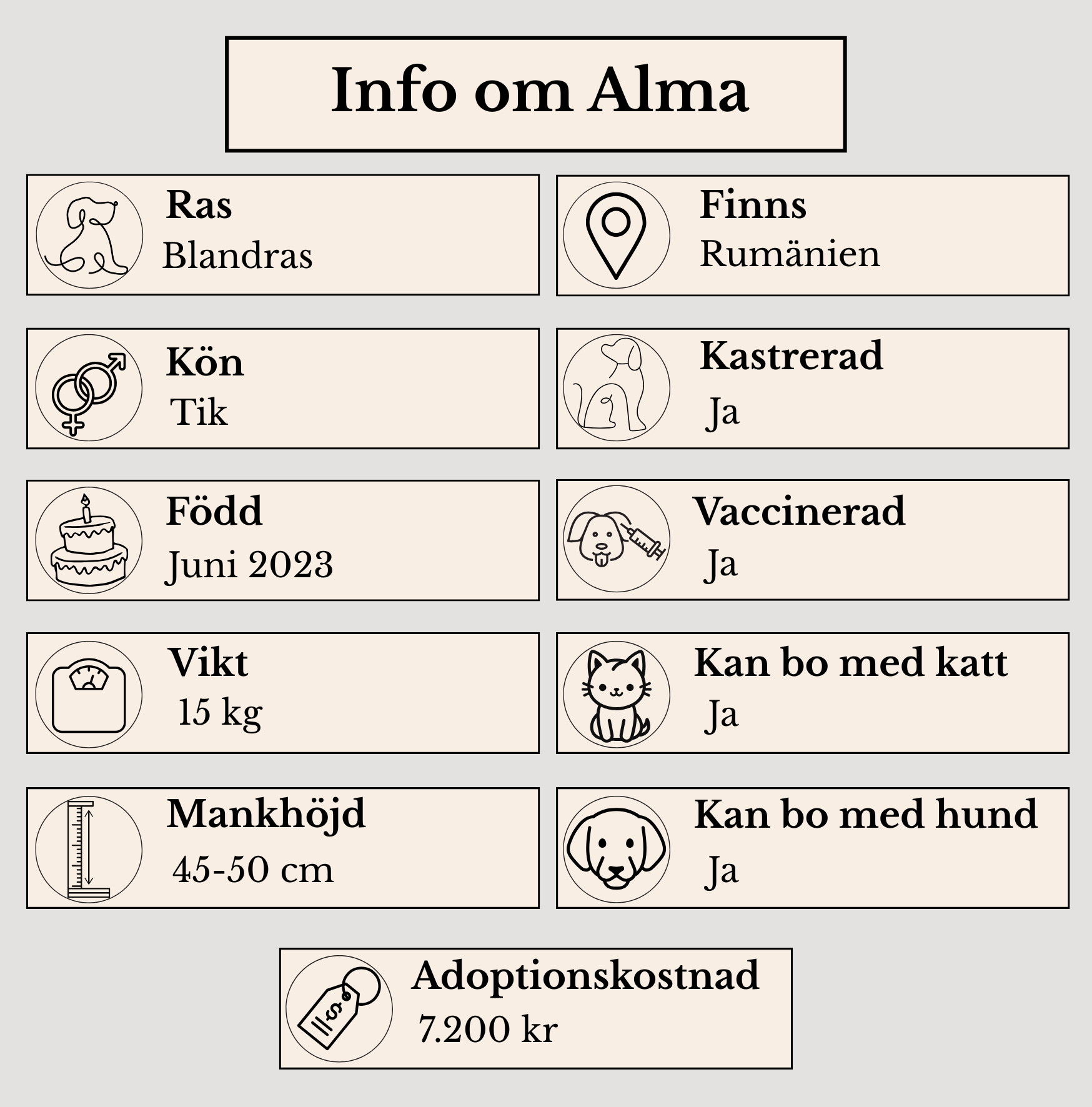 Alma är vaccinerad, kastrerad, chippad och innehar EU-pass.