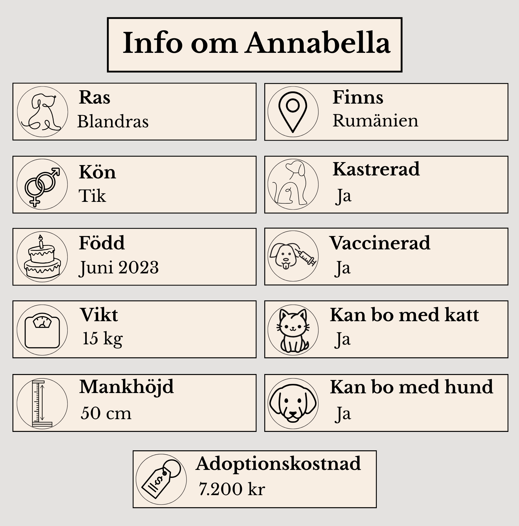 Annabella är ca 50 cm hög och väger 15 kg. Annabella kommer till Sverige kastrerad, vaccinerad, chippad och med EU-pass.