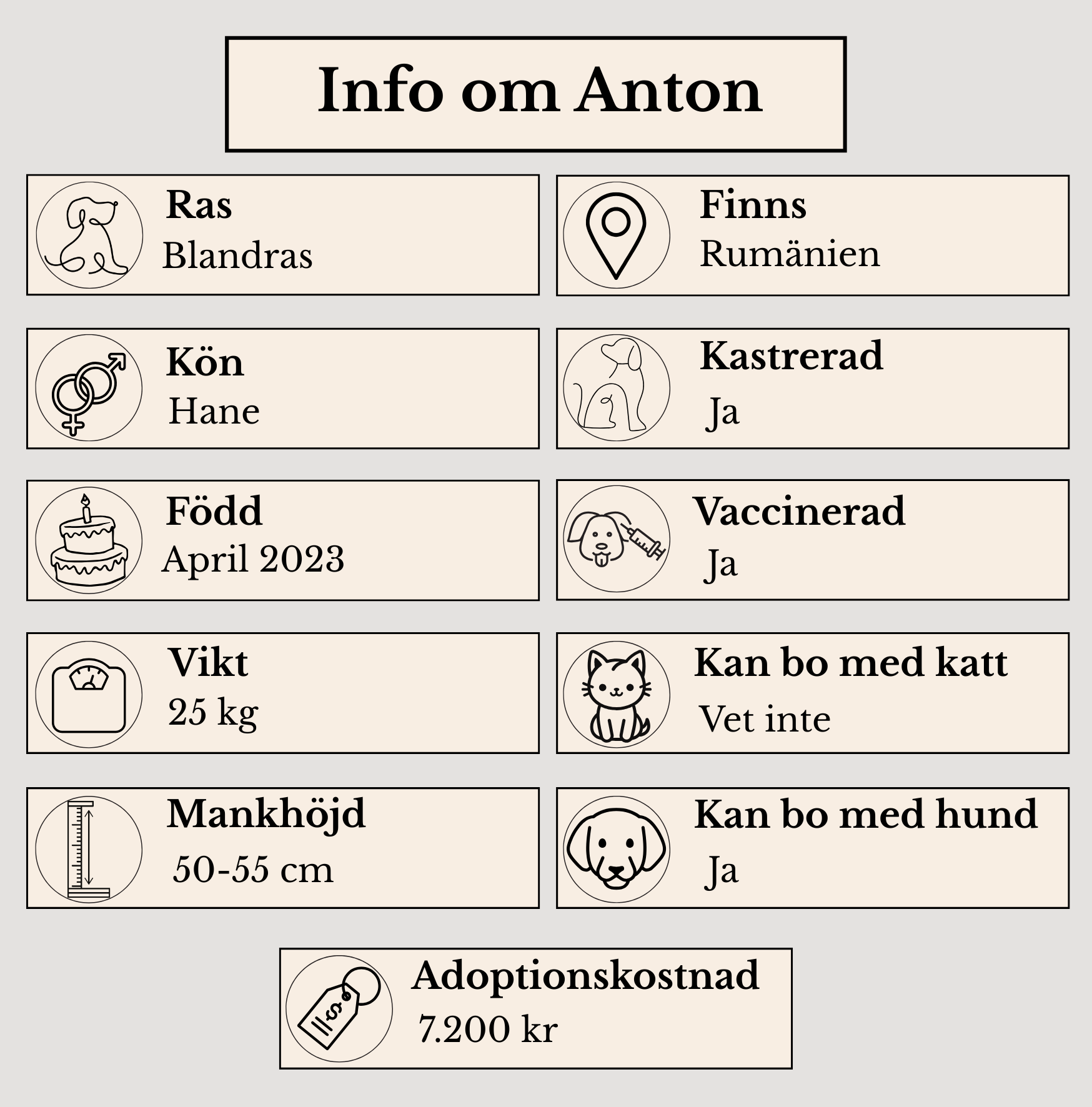 Anton söker en familj som är tålmodig och förstående gentemot hans bagage. Han vill utmanas och ser fram emot vad ett liv innebär med en egen familj. Anton vill ta långa promenader i utvecklande miljöer och utforska nya dofter. Han skulle gärna springa fritt i rastgård och få sträcka ut sig ordentligt. Anton trivs väl med andra hundar och skulle kunna bo tillsammans med annan hund men även som ensamhund där han få stå i fokus.