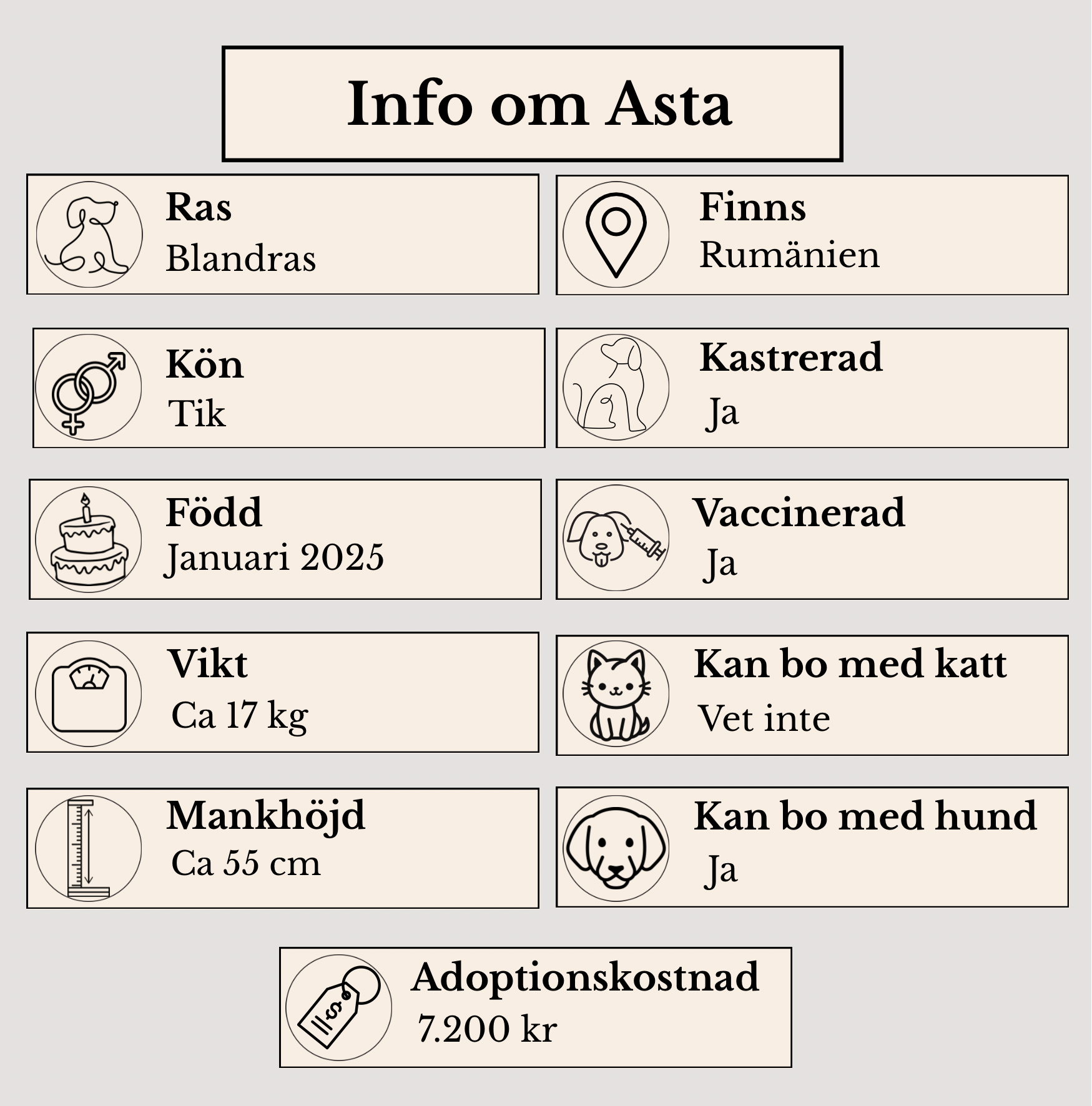 Till Asta söker vi en familj som vill lägga grunden för ett tryggt och härligt liv. Tålamod och kärlek är viktiga delar i Astas framtid och framgång. Vi önskar att hon ska få ett liv fullt med äventyr och sköna upplevelser. Asta skulle gärna få lära sig några kommando och tricks, det skulle hon tycka vara roligt. Asta trivs väl med andra hundar och skulle gärna finna en familj med annan hund i, men så även trivas som ensam hund där hon får stå i full fokus.