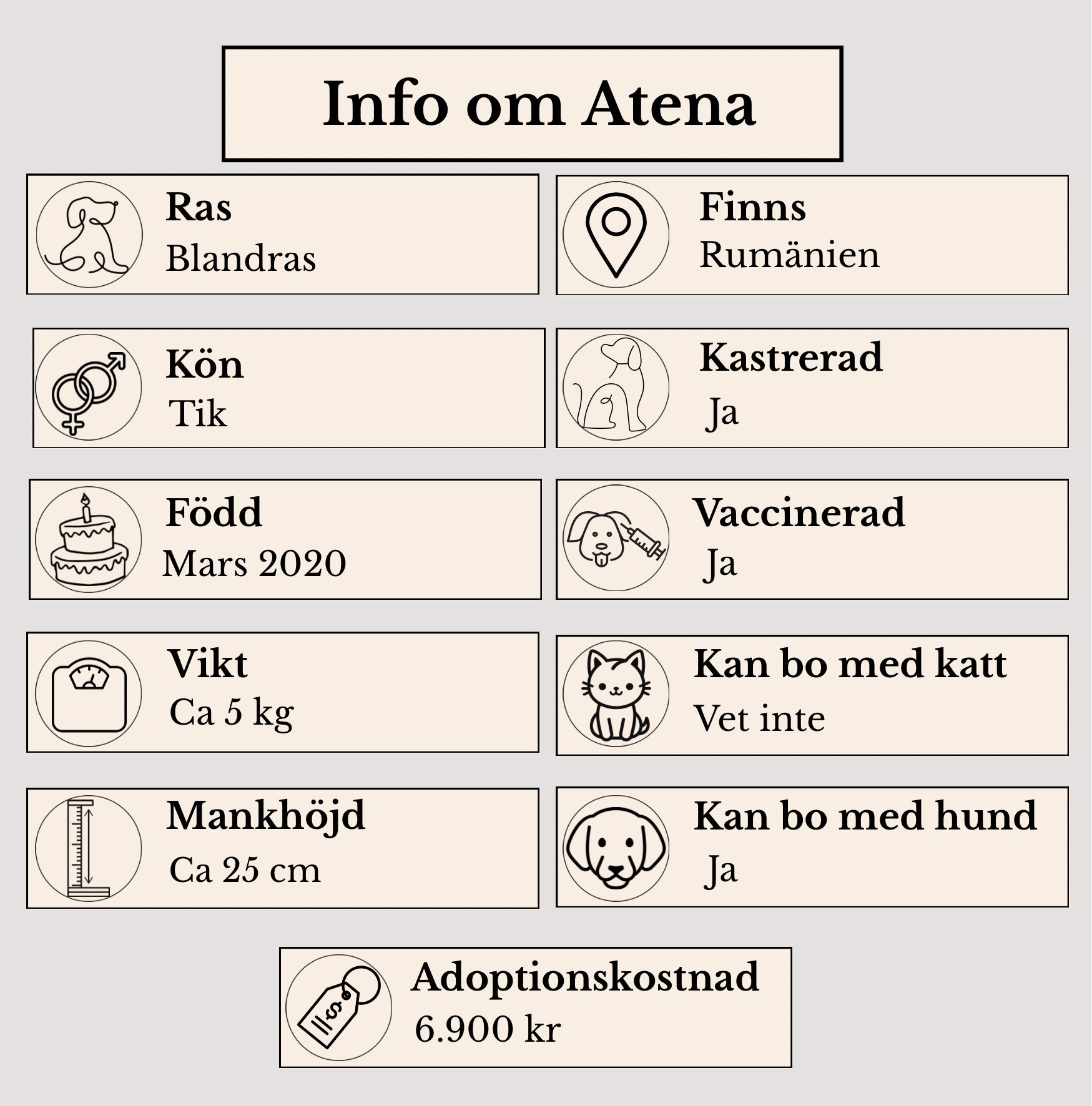 Till en början kan Atena vara lite försiktig i nya situationer, men när hon väl känner sig trygg släpper det och hennes fina, mjuka personlighet får ta plats. Med tålamod och kärlek blommar hon ut och visar vilken underbar följeslagare hon kan bli.