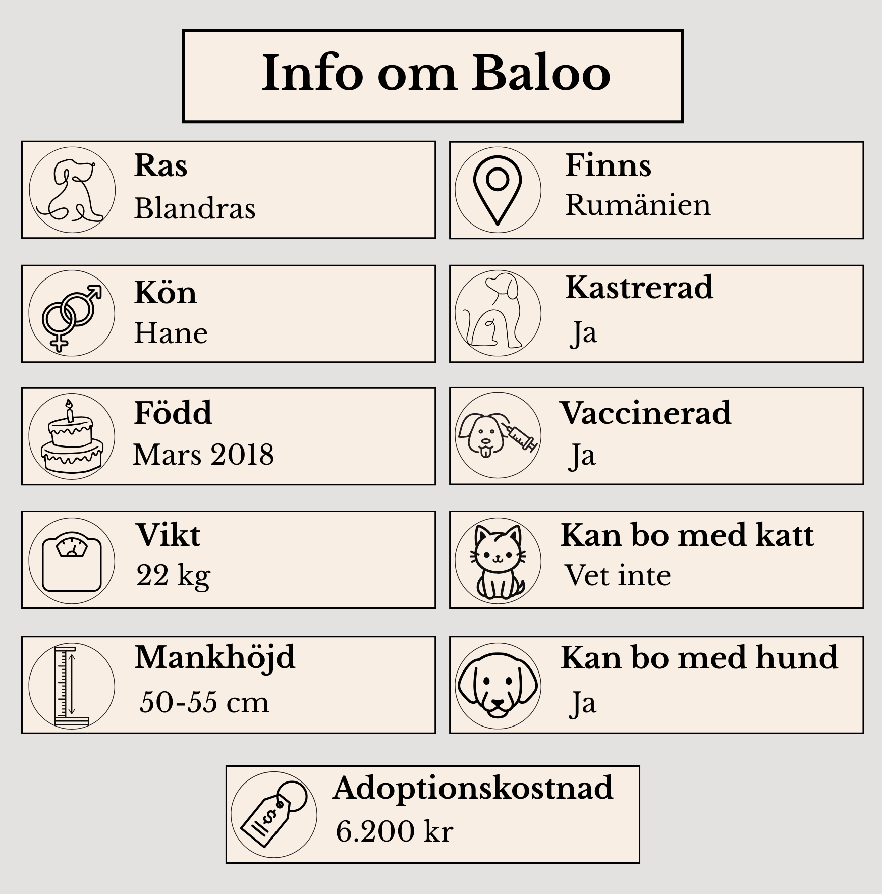 Baloo längtar efter mer än hägnet kan erbjuda. Han önskar få uppleva skog och natur i Sverige tillsammans med en tillitsfull familj. Baloo skulle gärna utveckla sig och bli en trygg individ. Han vill få en uppgift och tillsammans med en familj hade han funnit det ljuvligt att få utmanas. Baloo skulle gärna bo tillsammans med annan hund men även trivas som ensamhund där han får stå i fokus.