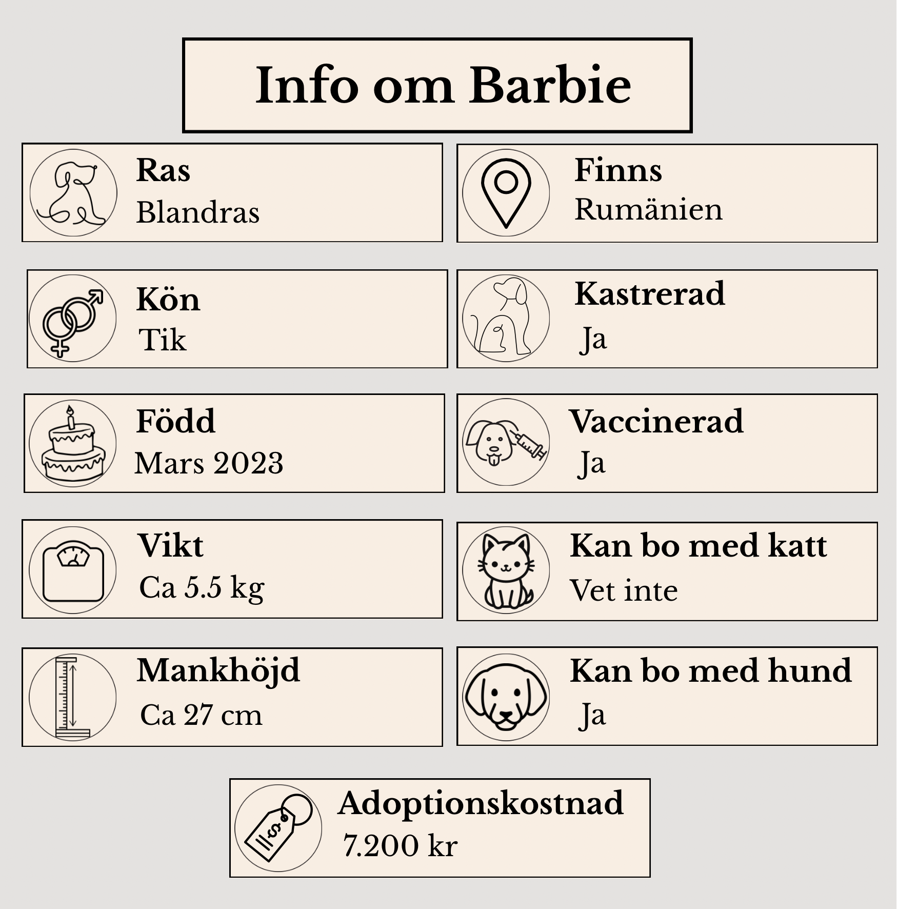 Till en början kan Barbie vara lite försiktig, men när hon känner sig trygg släpper det och hennes kärleksfulla, charmiga sida kommer fram. Hon söker ett hem där hon får tid och omtanke, och där kärlek och trygghet står i fokus.
