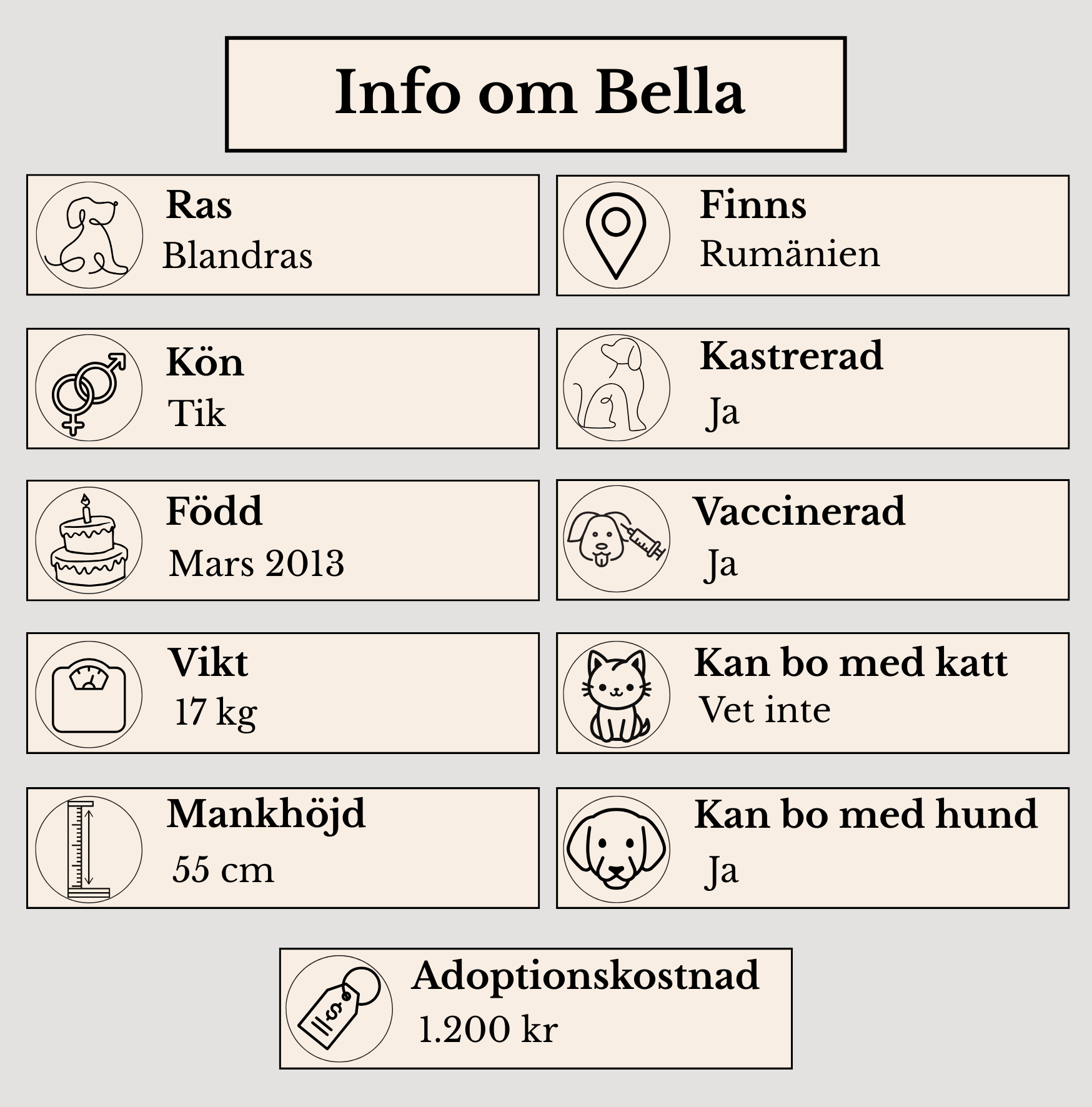 Familjen som öppnar sitt hem och hjärta för Bella får en ovärderlig följeslagare i vardagen. Bella söker en tålmodig och harmonisk familj som vill vara en trygg vägledning i allt nytt som komma skall. Hon vill ta sköna promenader och njuta av allt som finns att upptäcka. Bella trivs väl med andra hundar och skulle gärna bo tillsammans med annan hund. Hon skulle så även trivas som ensamhund där hon får stå i fokus. Bella går fint i koppel.