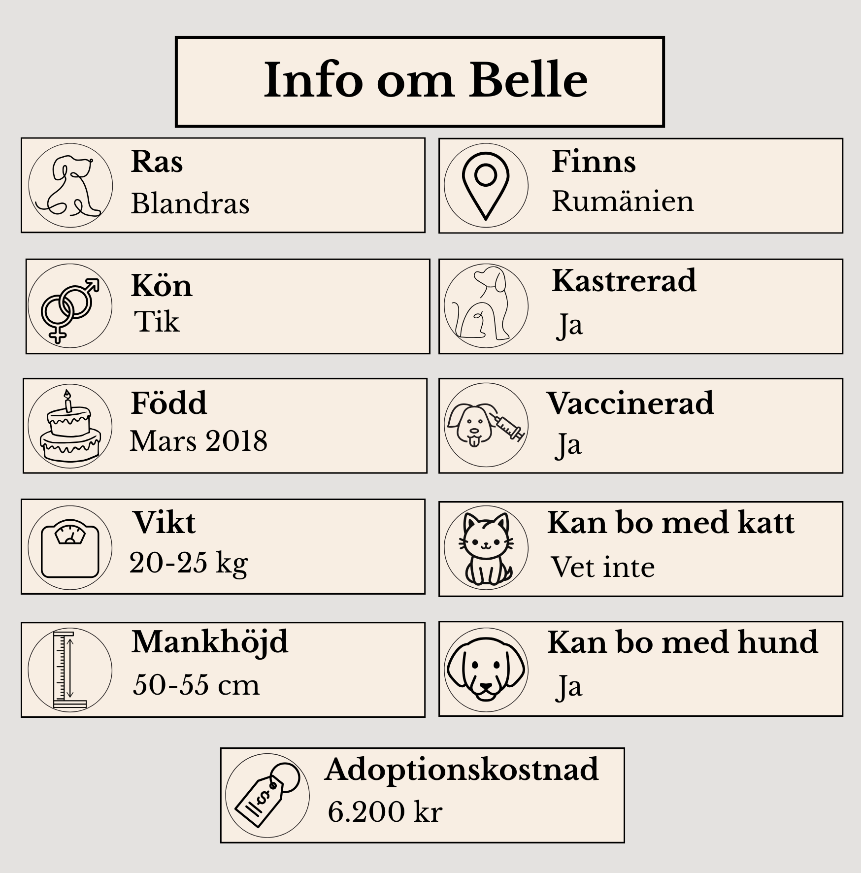 Belle är en härlig tik, beräknad född 2018, som nu letar efter en trygg och kärleksfull familj. Hon är en glad och trevlig hund med mycket nyfikenhet och en busig glimt i ögat. Samtidigt kan Belle vara lite försiktig, särskilt i nya situationer, och behöver därför ett hem som har förståelse, tålamod och ett lugnt bemötande.