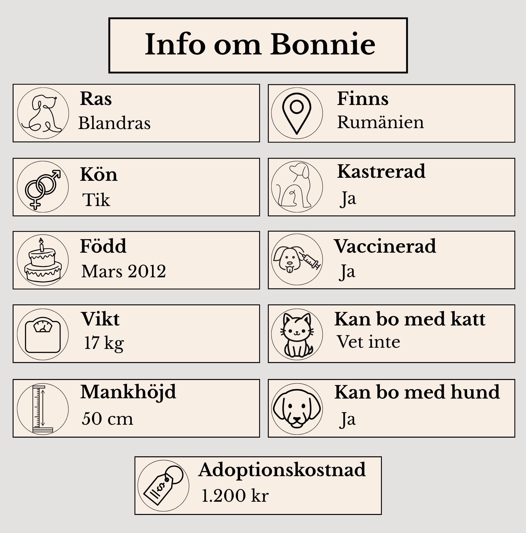 Familjen som tar emot Bonnie får en sann följeslagare när de vunnit hennes förtroende. Hon söker ett harmoniskt och tryggt hem som ser charmen i hennes varsamma sätt. Bonnie vill gärna vara del av vardagen och följa med på smått som stort. Ta sköna promenader och njuta av det goda hundlivet. Hon trivs väl med andra hundar.