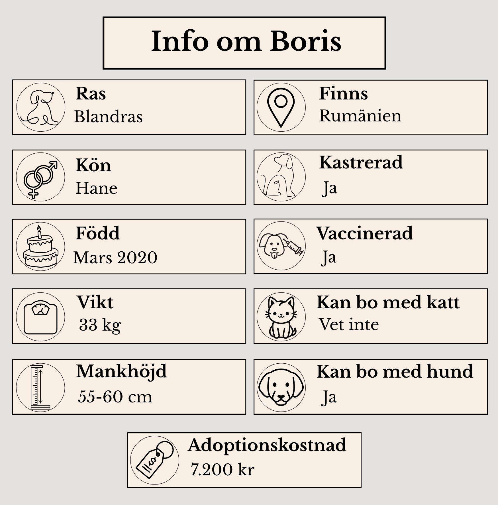 Familjen som blir Boris får en trogen livskamrat. Boris söker en rörelseglad familj som tillsammans vill utforska och upptäcka. Långa sköna promenader, lek i rastgården eller lära sig några tricks. Boris säger ja till precis allt det. När kvällen kommer vill han gärna vila mjukt jämte sin familj. Boris trivs väl i sällskap av andra hundar och bor gärna med annan hund. Han tar gärna chans till lek och stoj. Boris är lyhörd och lyssnar noga in människan som annan hund.