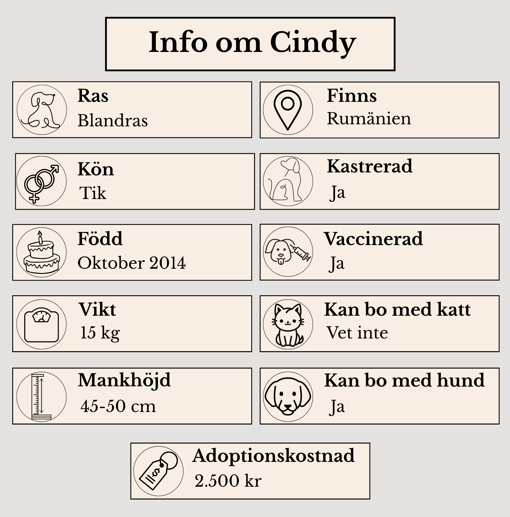 Familjen som fångar Cindys hjärta och tillit får en sann bästa vän. Det är viktigt att låta henne blomma ut i sin takt. Cindy drömmer om en harmonisk och tålmodig familj som är närvarande. Hon vill bygga en trygg grund att stå på och även bli en modigare individ. Cindy skulle trivas väldigt väl i sällskap av annan hund men så även trivas som en ensamhund. Hon önskar ta sköna promenader och njuta av lugnet som blir hennes vardag.