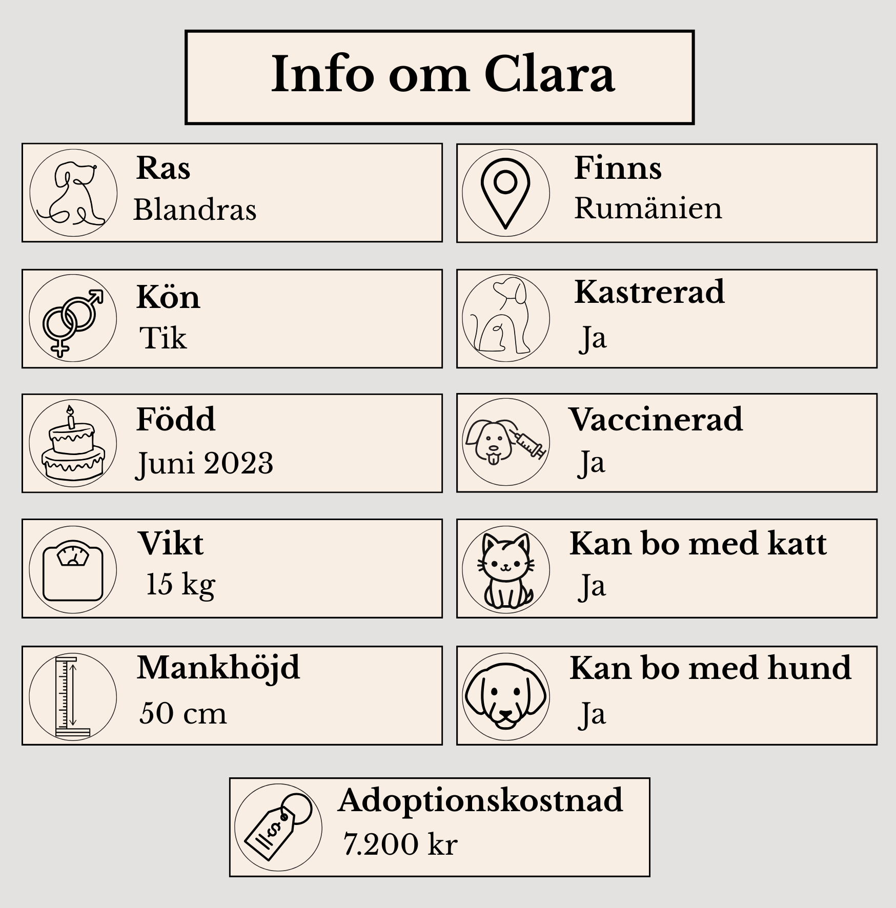 Clara har ännu inte fått uppleva det goda livet utanför hägnet. Hon tillhör en syskonskara som alla finns i vårat hägn i Rumänien. Clara tillsammans med sina syskon har ingen erfarenhet på livet utanför hägnet. De har allihopa vuxit upp där. Hägnet är en trygg plats men det hämmar en sund och god utveckling för en hund.