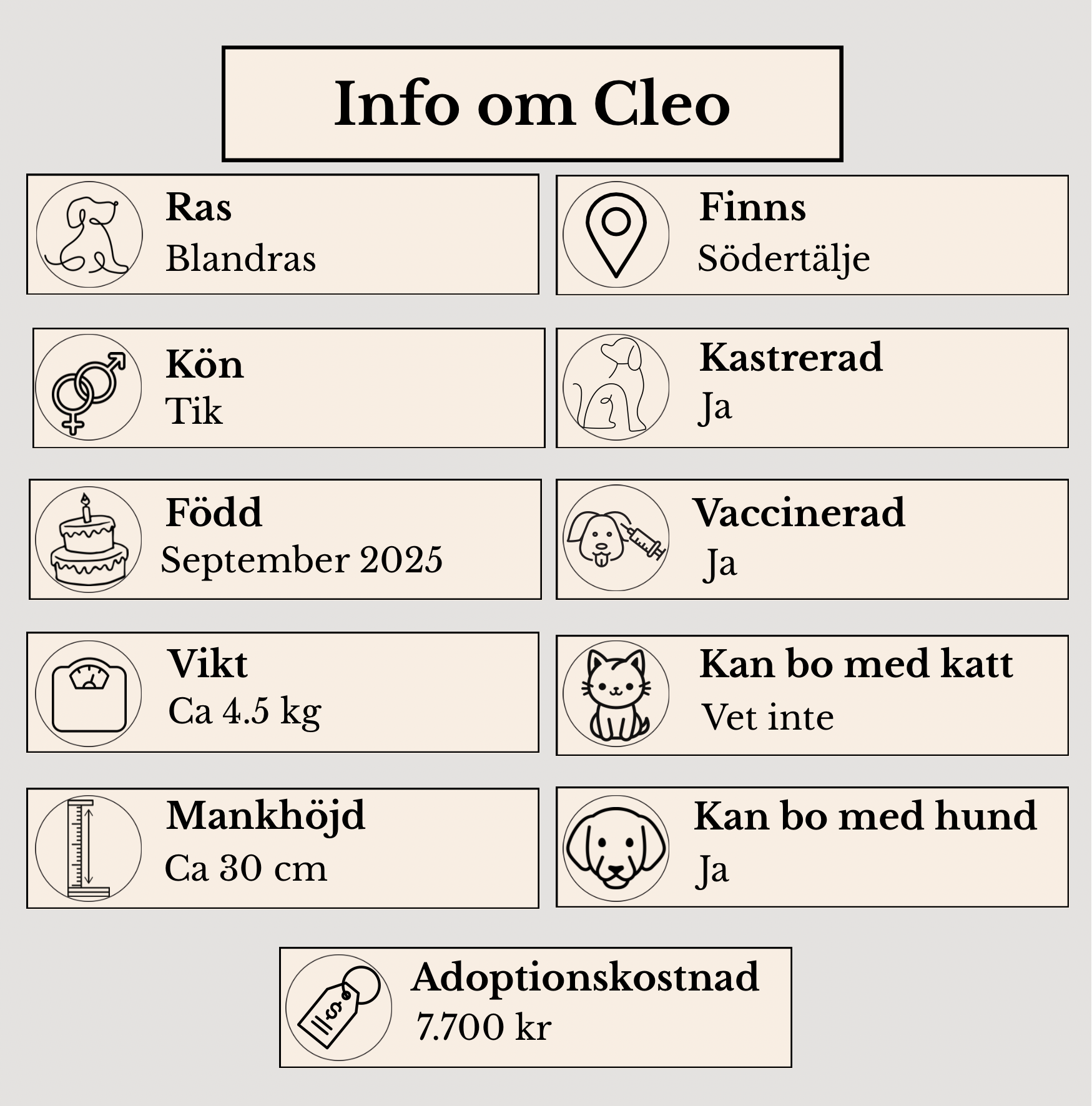 Cleo är en charmig liten tik, född sommaren/sensommaren 2025, som nu söker sitt för-alltid-hem. Hon är en busig och lekfull tjej med mycket kärlek att ge till sin framtida familj. Cleo älskar att utforska världen genom lek och närhet, och hon gillar att busa med sina kompisar.