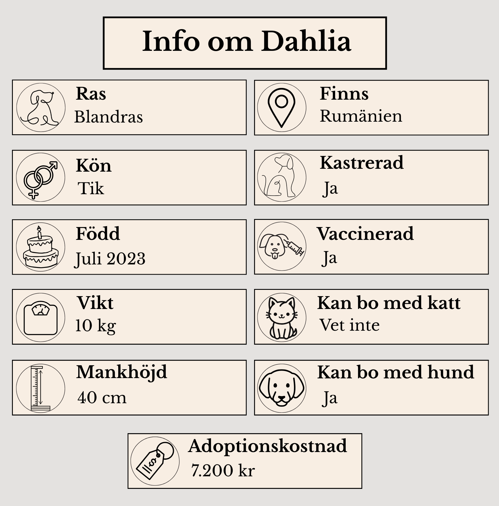 Dahlia vår lilla blomma är en fantastisk tik som kämpat för sina valpar. Hon är en snäll och nyfiken tik som gärna tar emot klappar och gos. Vi önskar att Dahlia snart ska finna sin egen familj och få uppleva riktig kärlek och värme i ett hem.