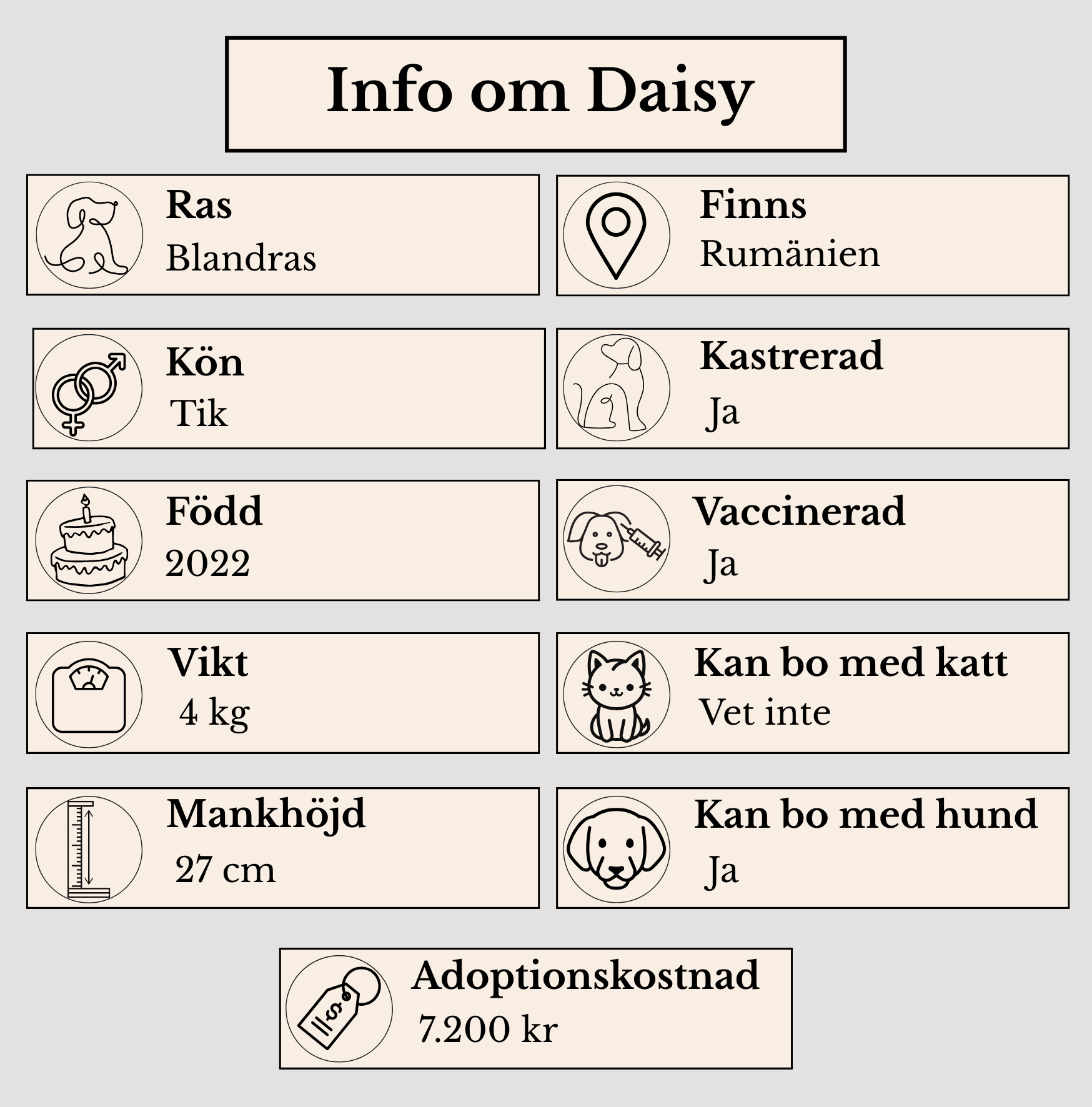 Familjen som adopterar Daisy önskar vi ska vara harmonisk och kärleksfull. En viktig del är att Daisy känner sig som en del av familjen och får följa med i vardagen. Hon har än inte fått uppleva så mycket och önskar därmed få chans i kommande familj att ta sig an utmaningar i vardagen och upptäcka nya härliga platser och miljöer. Daisy tycker det är härligt att sträcka ut sig ordentligt i rastgården och ströva fritt. Hon önskar träna på att gå i koppel bättre.