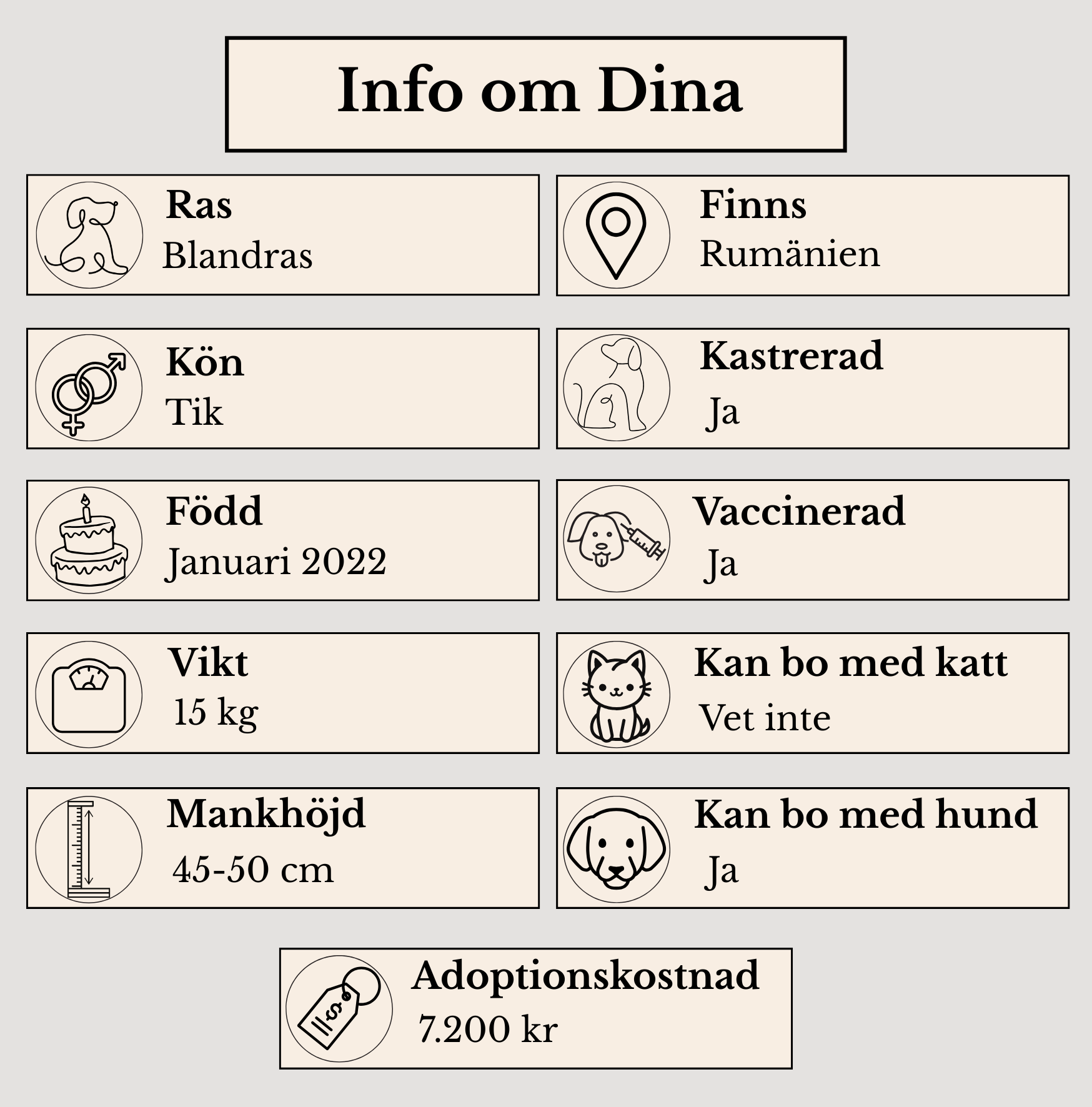 Vi söker en tålmodig och lugn familj till Dina som förstår hennes bakgrund. Vi önskar att Dina ska få de bästa förutsättningarna för att bygga självförtroende och mod. Dina har inte fått rätta förutsättningarna för att kunna lita på människan och det önskar vi att familjen som adopterar Dina vänder på. Dina trivs i sällskap av andra hundar och skulle med fördel bo tillsammans med annan hund som kan visa henne vägen. Hon går väl i koppel. Dina skulle njuta till fullo av promenader i omväxlande miljöer.