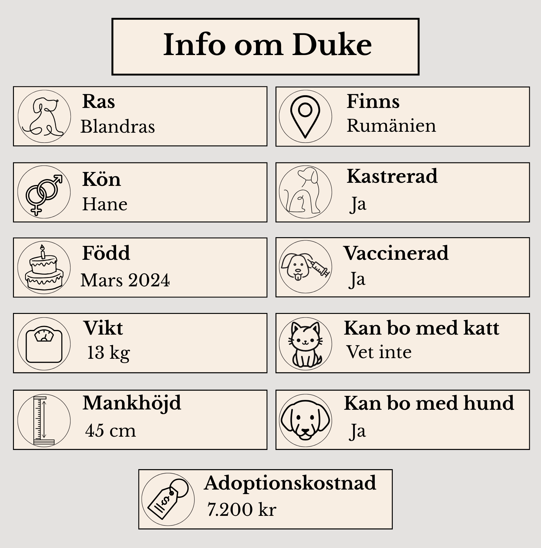 Dukes erfarenheter av världen är ännu få. Han vill gärna våga upptäcka och utforska men modet sviktar stundvis. Tillsammans med en trygg och tålmodig familj skulle Duke ta för sig mer och ta sig an nya miljöer. Han söker en familj som vill hjälpa han framåt i livet. Duke vill få uppleva allt han inte fått chans till. Han önskar finna en familj som ser vinst i varje framsteg, även de små. Sköna långa promenader i utvecklande miljöer är Dukes melodi. Duke trivs väl med andra hundar och skulle med fördel kunna bo med annan trygg hund som kan vägleda.