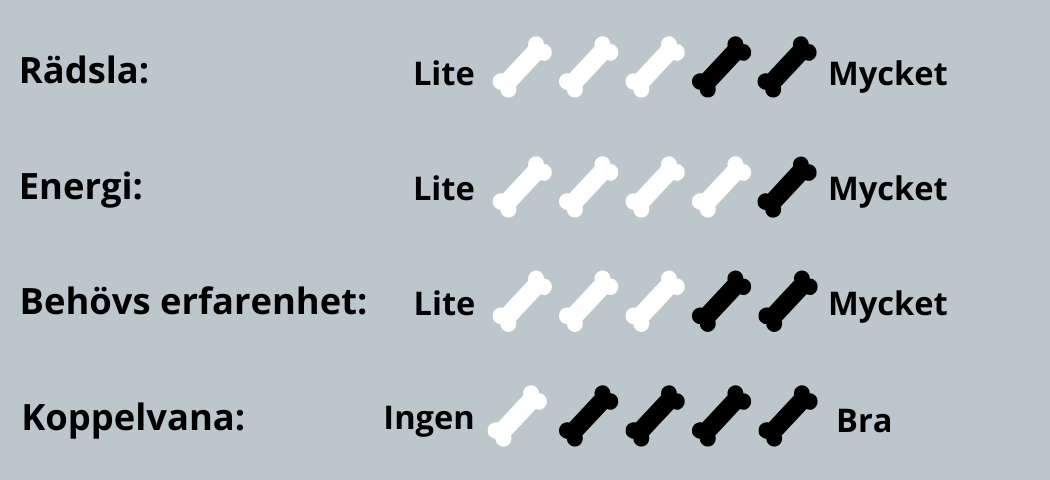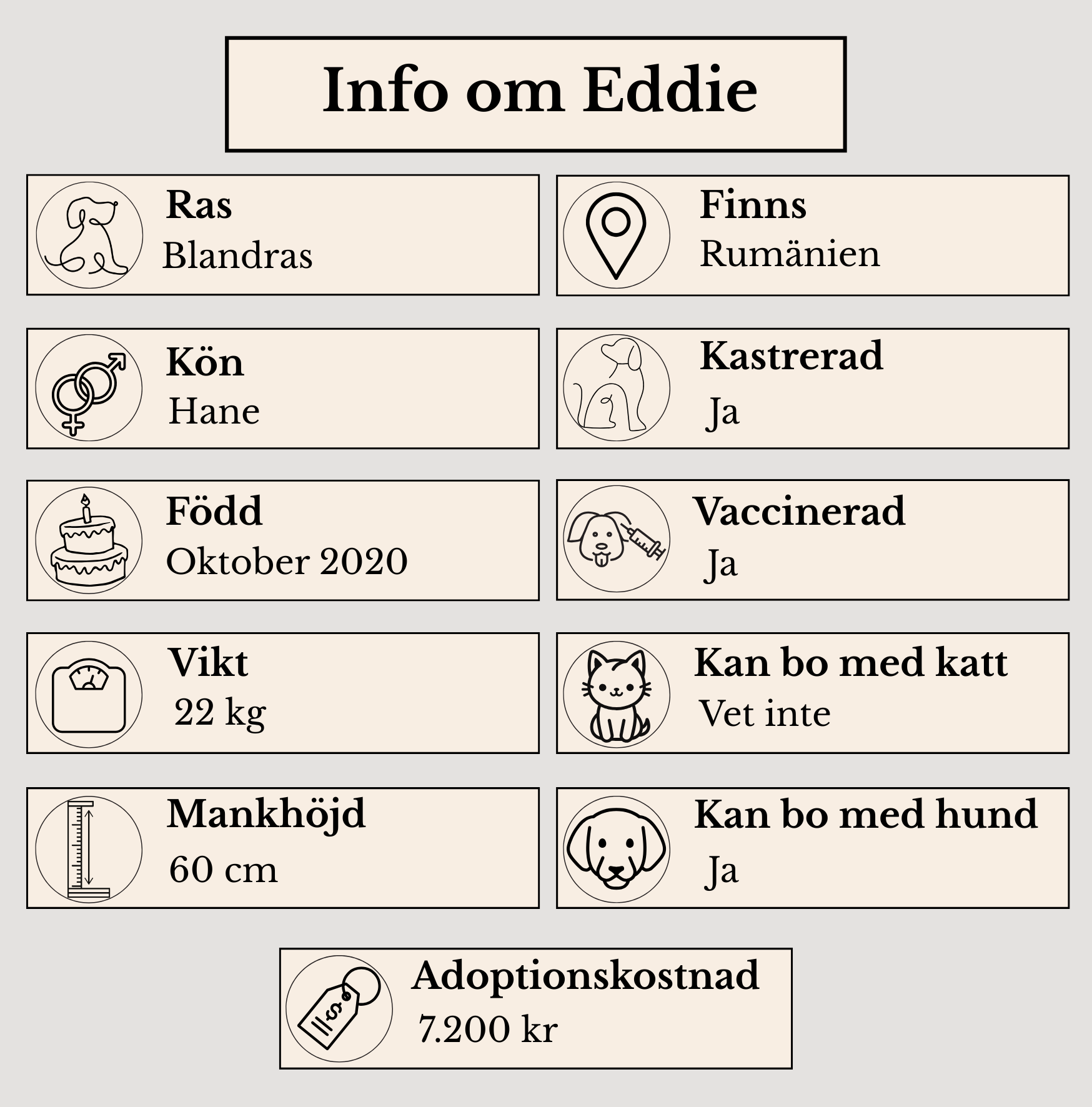 Eddie behöver träna på att gå i koppel. Han har okej tandstatus. Eddie är kastrerad, vaccinerad, chippad och har EU-pass.