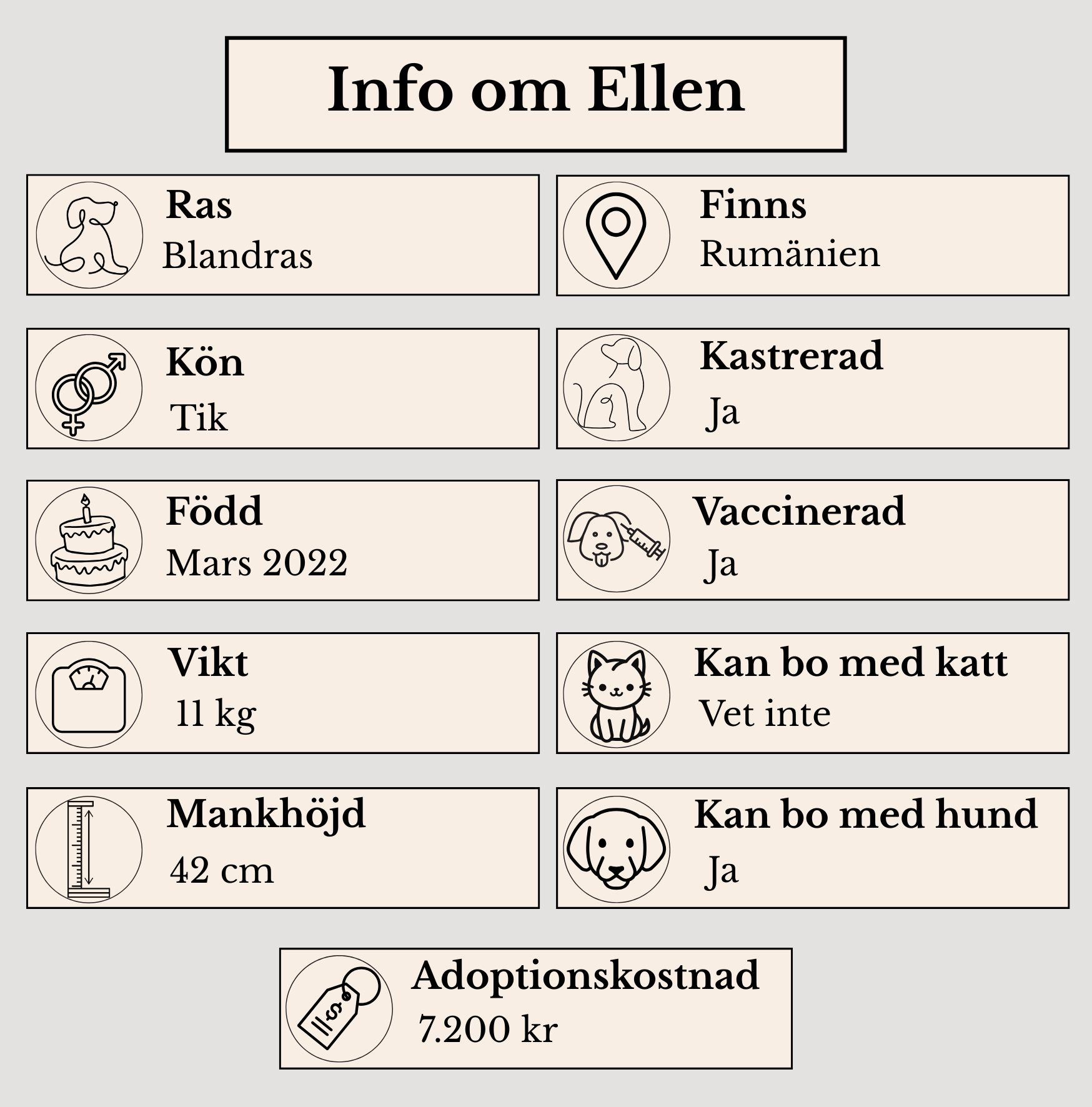Ellen skulle passa dig som vill ha en följeslagare som vill ta långa promenader och utforska miljöer tillsammans. Framför allt skulle hon älska om familjen tycker om närhet och gos precis lika mycket som hon gör. Vi önskar att familjen som adopterar Ellen visar henne vägen i ett nytt berikat liv. Hon skulle gärna bo med annan hund. Hennes bror Douglas har blivit reserverad och kommer resa nästa transport och deras syster Ninni har redan funnit sin familj i Sverige