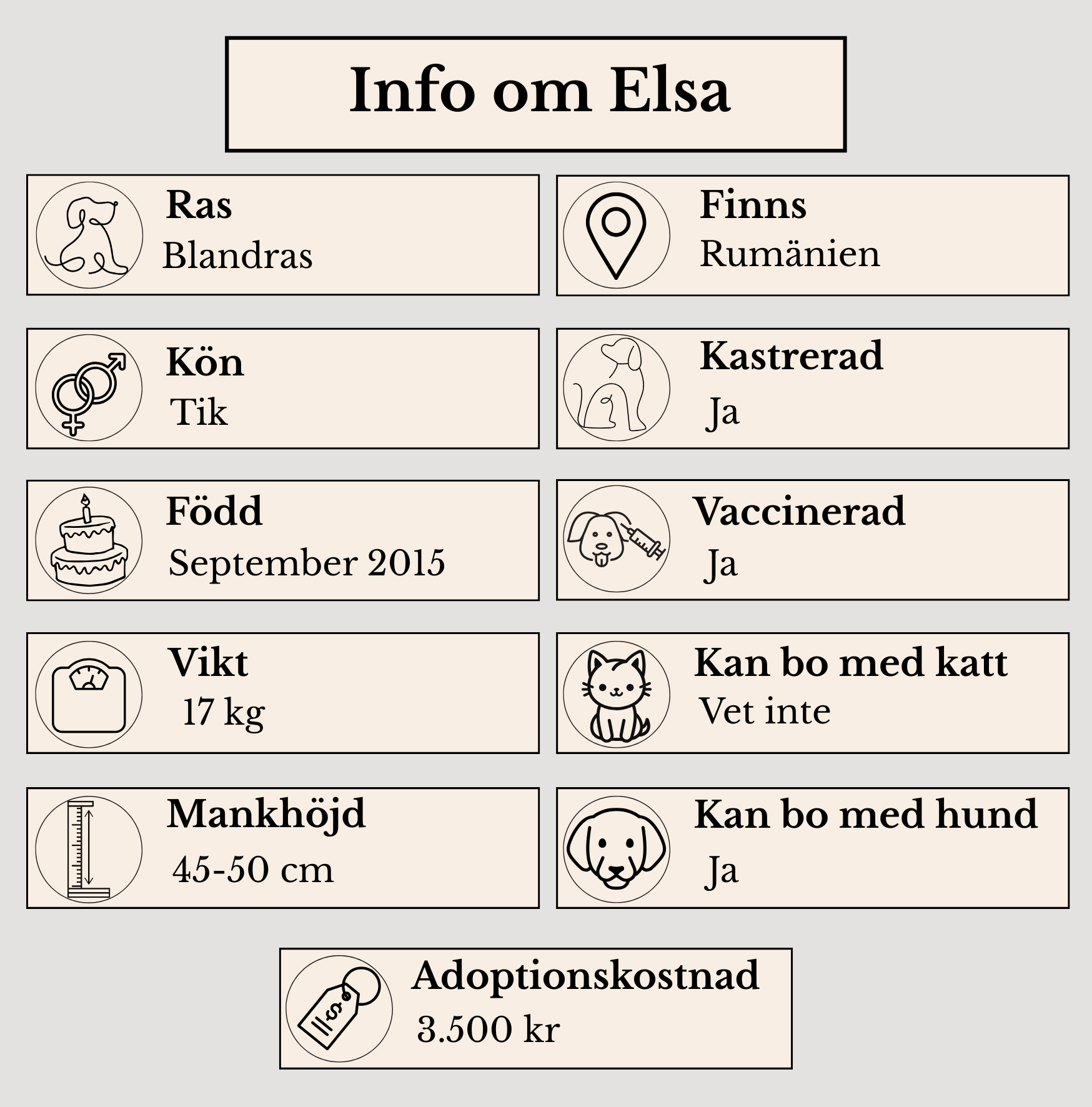 Vi önskar att Elsa ska tas emot av en kärleksfull familj som har tålamodet för att låta henne komma till ro och finna lugnet. Elsa är oerfaren på livet utanför hägnet men vill gärna utforska och lära sig om nya miljöer. En trygg och även van vägledning kommer öka Elsas självförtroende. Elsa skulle må gott av att få vila mjukt i en bädd och ta mysiga promenader där i mellan. Hon trivs väl med andra hundar och skulle gärna bo tillsammans med annan hund som kan visa henne vägen.
