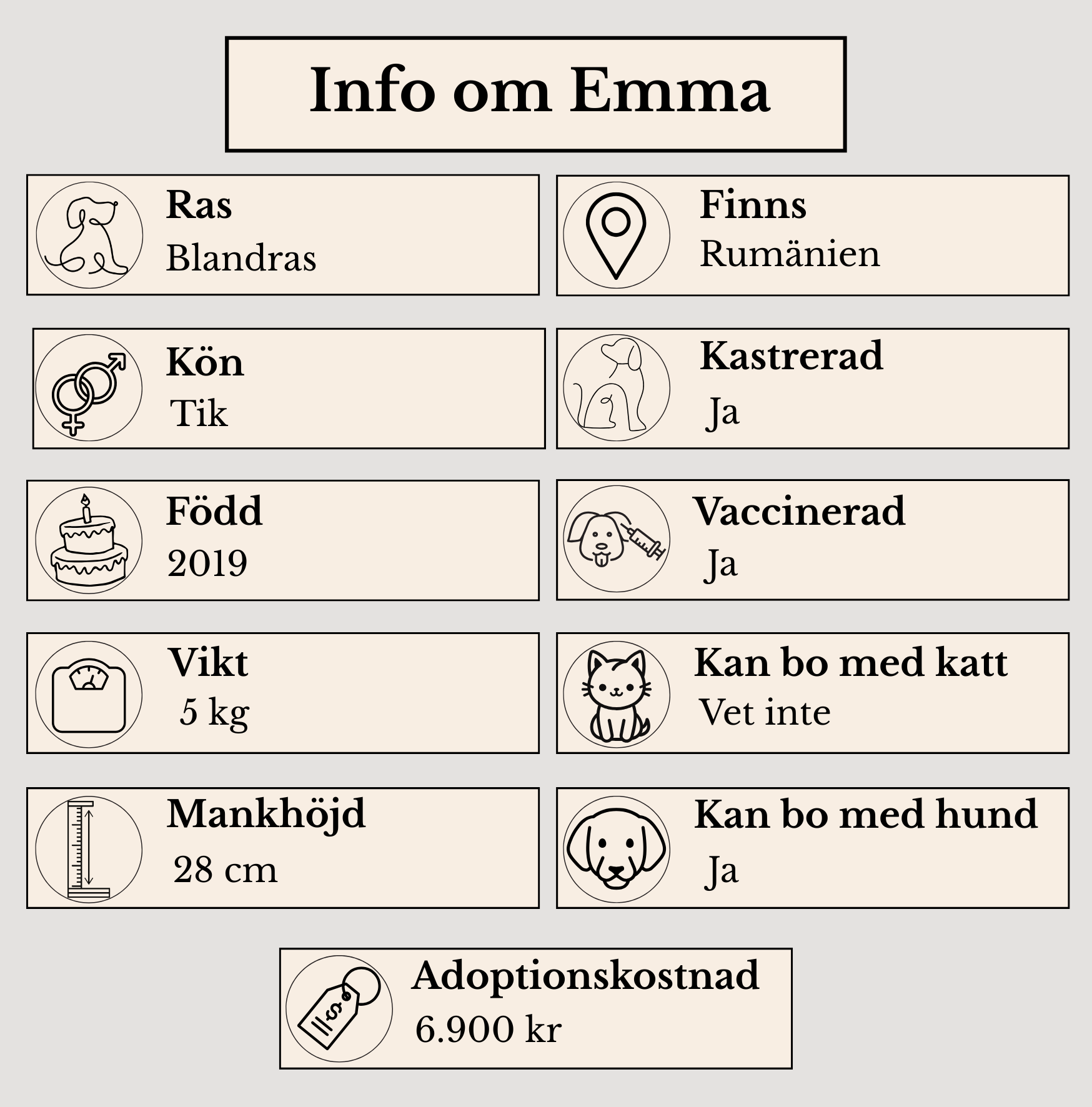 Familjen som tar emot Emma får en sann följeslagare i vardagen. Hon är mycket lojal och vill gärna lära. Familjen som adopterar Emma önskar vi ska vara trygg och kärleksfull. Emma ser fram emot sköna promenader i skog och mark, kanske tillfälle att springa fritt i rastgården. Hon trivs mycket väl med andra hundar och skulle gärna bo med annan hund men även trivas mycket bra med andra hundar.
