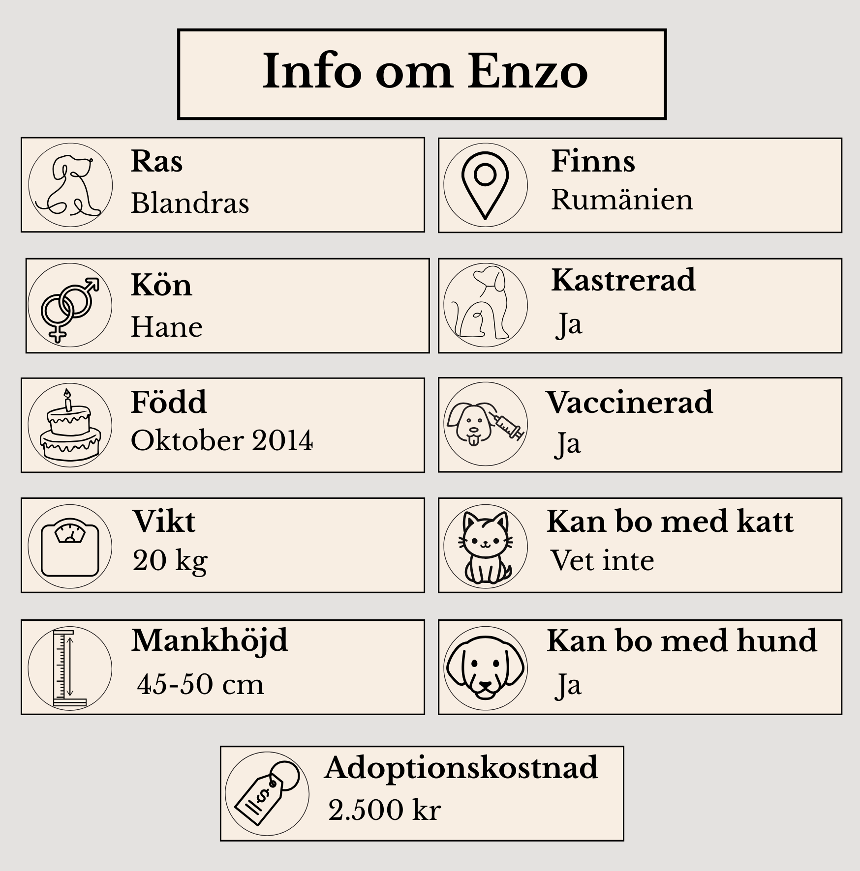 Vi önskar att Enzo ska få en trygg familj som vill utmana han i sin oerfarenhet. Då Enzo spenderat hela sitt liv i hägnet finns det mycket han ännu inte fått uppleva. Att utmana han kommer öka hans mod och bygga en trygg grund att stå på. Familjen som adopterar Enzo behöver ha tålamod och tid för att låta han anpassa sig till ett nytt liv.