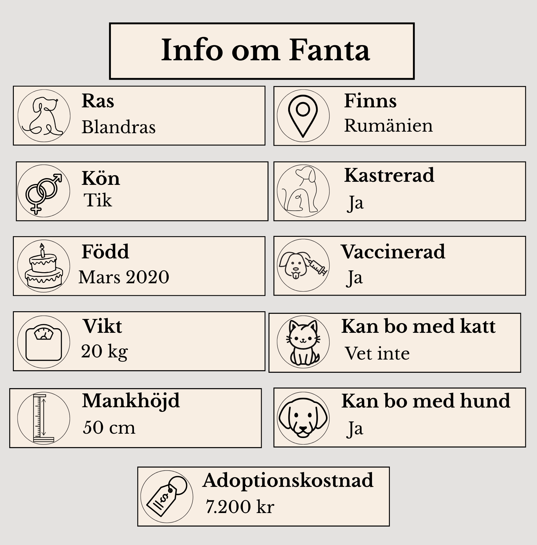 Fanta upplevs som en lugn hund men det kan också bero på att hon inte visar oss sin fulla potential. Fanta kanske inte är en nybörjarhund. Hon visar en sida av att vilja lyssna och följa, att hon vill göra allt för att vara till lags. Därmed är tålamod grunden för att bygga band och trygghet. Fanta kommer bli en underbar följeslagare.