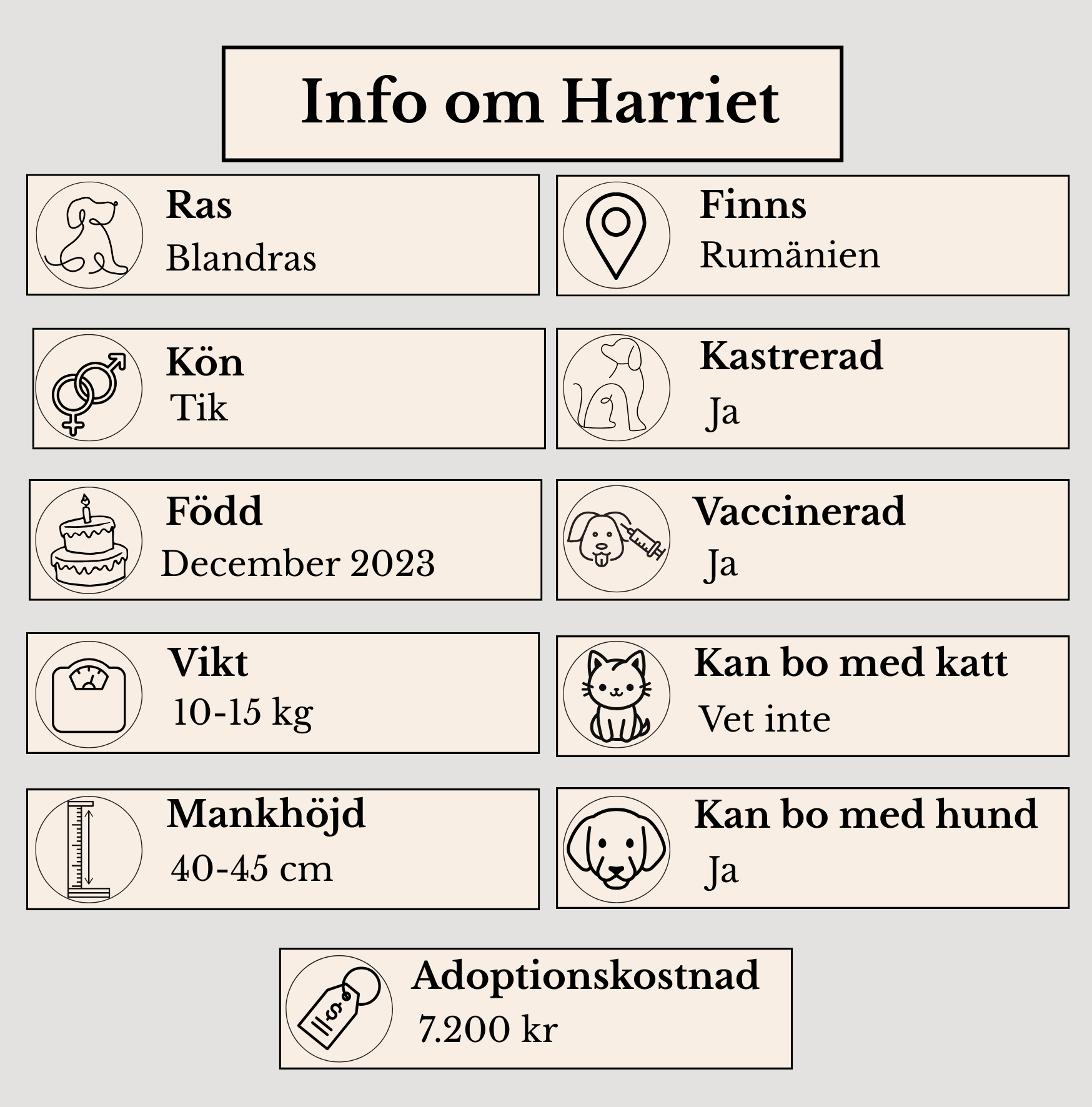 Harriet är en tik, beräknad född 2023, som nu söker ett tryggt och kärleksfullt hem. Hon är en snäll och trevlig hund som kommer fram med försiktighet, och hon ger ett mycket mjukt och ödmjukt intryck.