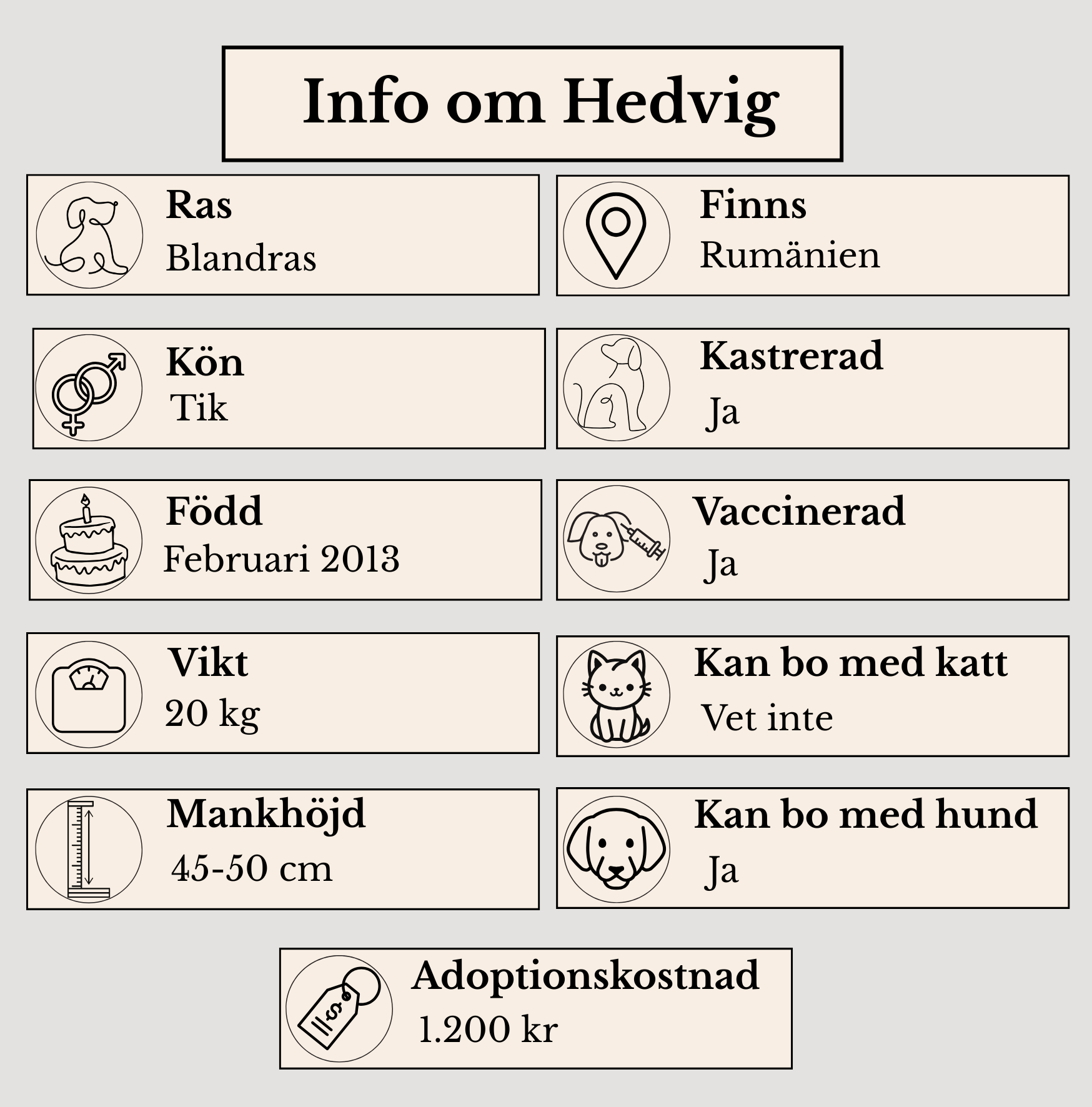 Hedvig är är äldre tik som är försiktig av sig. Hon har en stor integritet och går gärna runt och nosar och utforskar världen. Hon har förmodligen inga större erfarenheter av livet då hon suttit några år i hägnet. När hon väl släpper sin rädsla så tycker hon om uppmärksamhet och att bli klappad på. Den familjen som hon söker ska ge Hedvig tiden att kunna blomma ut. De behöver också ha tålamod för att inte stressa henne då hon säkerligen har en del i sin ryggsäck som gör henne osäker. Men vi tror att hon har en hel del kärlek som.hon längtar efter att få ge till sin alldeles egna familj.