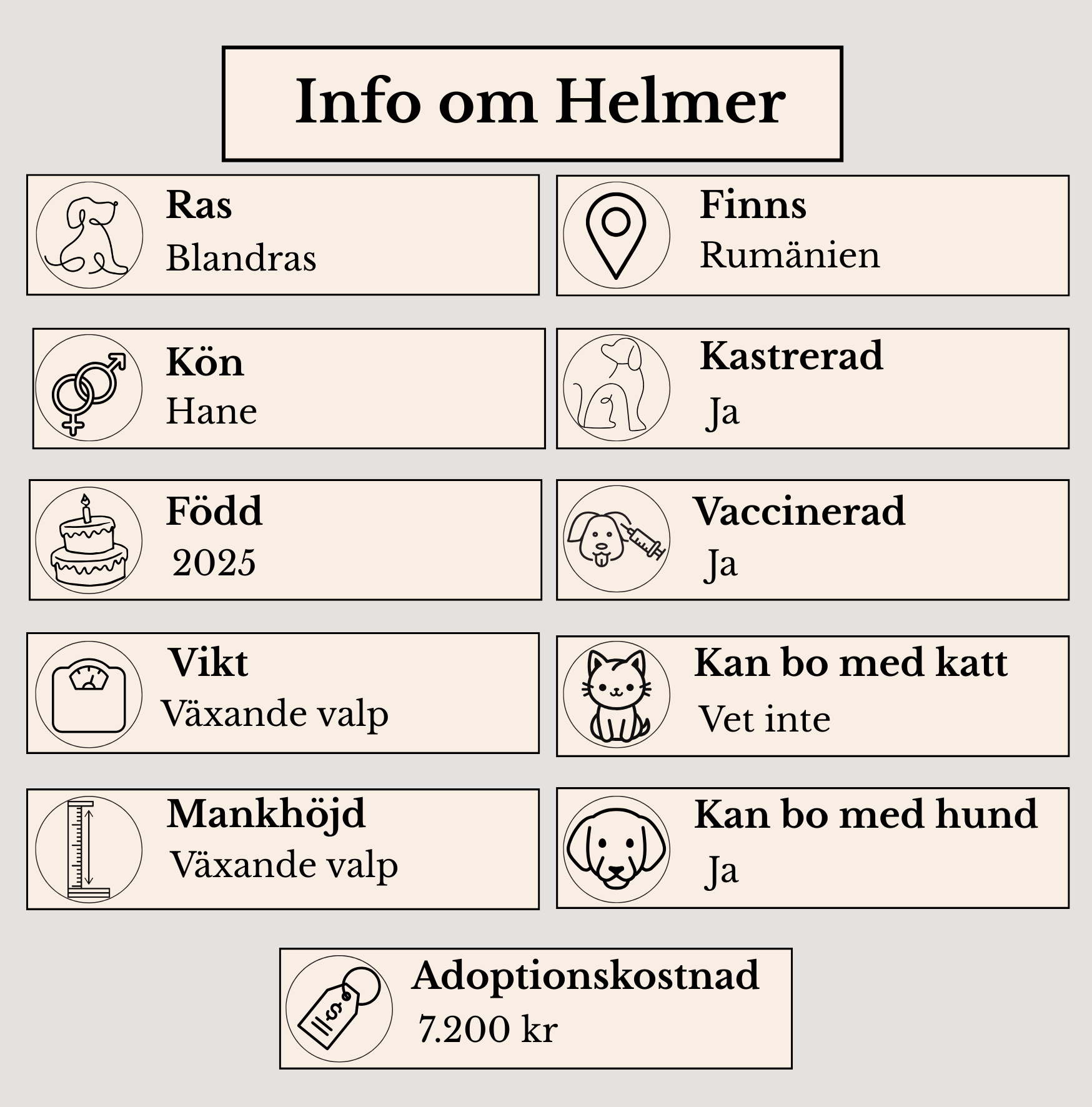 Helmer är en liten kille, beräknad född sensommaren/början av hösten 2025. Han är en charmig och nyfiken valp som beter sig precis som en valp ska – lekfull, upptäckarglad och full av liv. Han kom in tillsammans med sin mamma Mimmi och sina syskonen men tyvärr klarade sig inte någon av hans syskon.