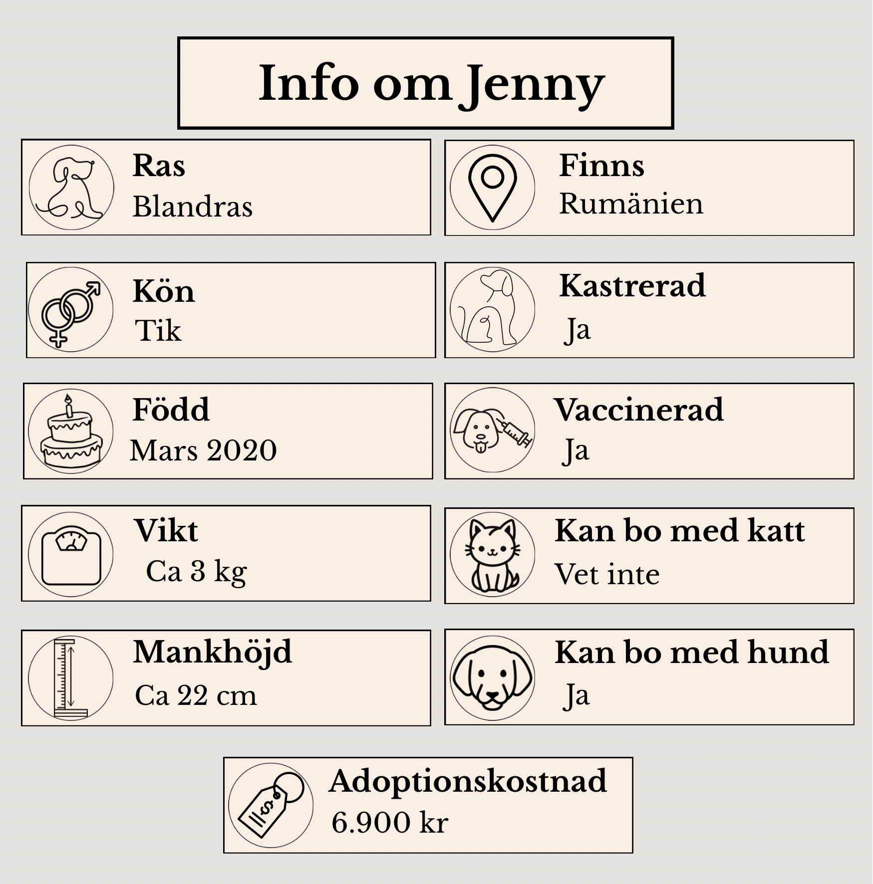 Till en början kan Jenny vara lite försiktig, men med trygghet, tålamod och omtanke släpper det, och hennes mjuka och härliga personlighet får blomma ut. Hon söker ett hem där hon får känna sig säker och älskad, och där hon får tid att knyta starka band med sin familj.