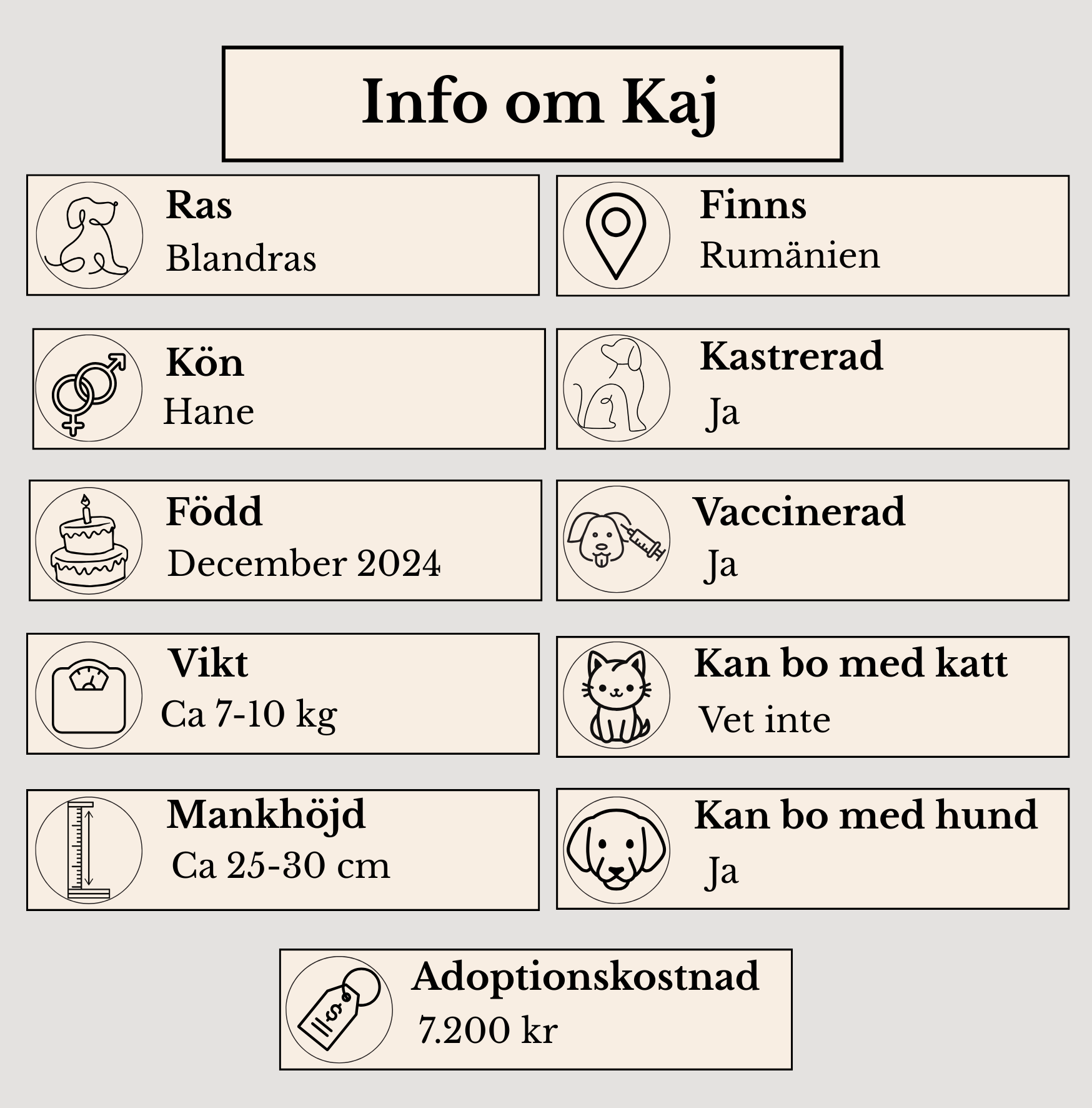 Kaj är en vacker kille, beräknad född 2024, med en försiktig start men ett stort hjärta. Till en början håller han gärna lite avstånd, men med rätt motivation – som en godbit – tar nyfikenheten snabbt över. Då vågar han komma fram, hälsa och njuta av klappar.