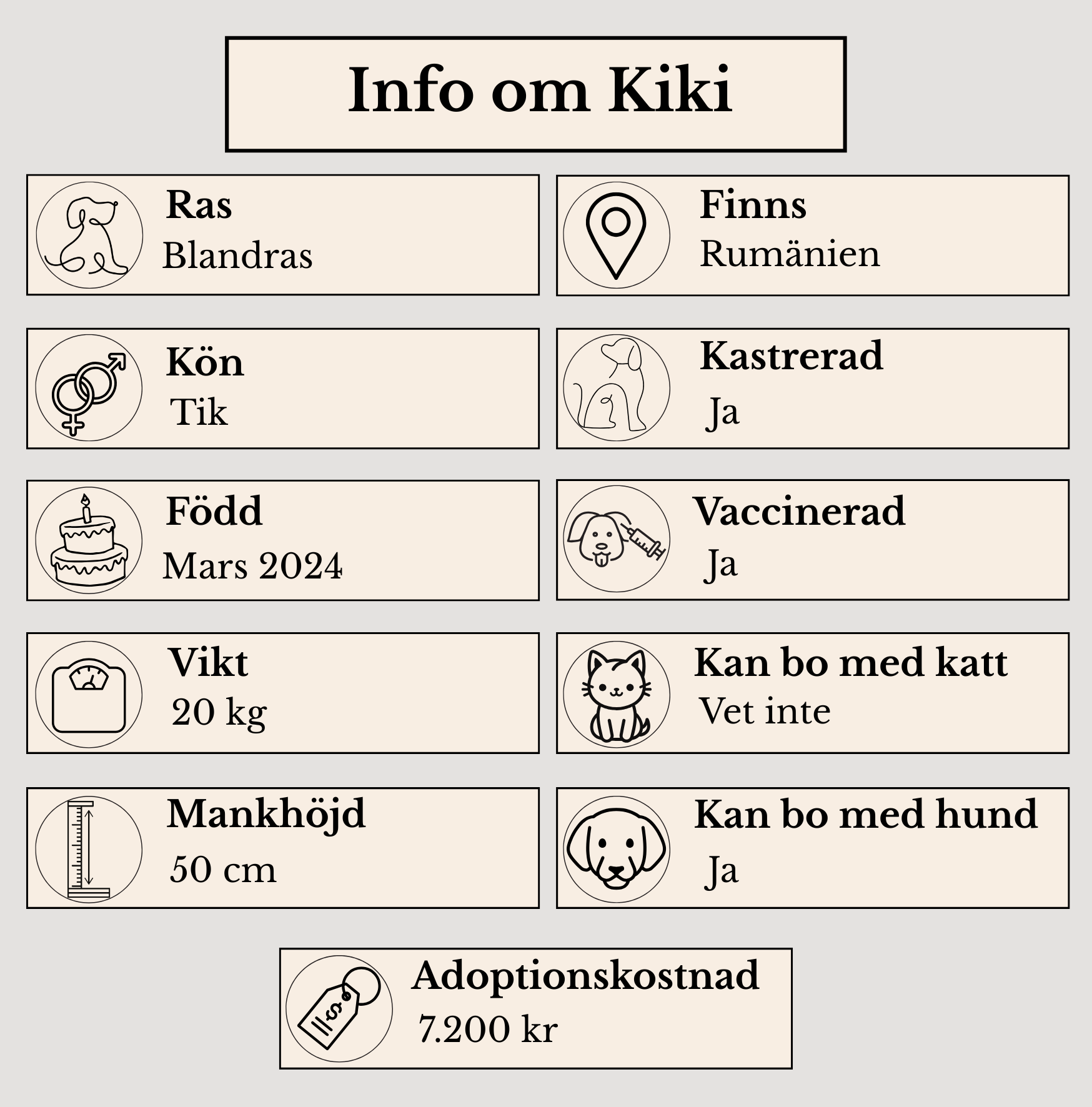 Familjen som öppnar sitt hjärta och hem för Kiki önskar vi ska vara trygg och kärleksfull precis som hon är. Kiki vill få följa med sin familj i vardagen, med små som stora äventyr. Hon önskar ta sköna långa promenader och springa fritt i rastgården. Det är stunder hon njuter som allra mest. Hon går helt okej i koppel. Kiki bor gärna tillsammans med annan trevlig hund som kan visa vägen.