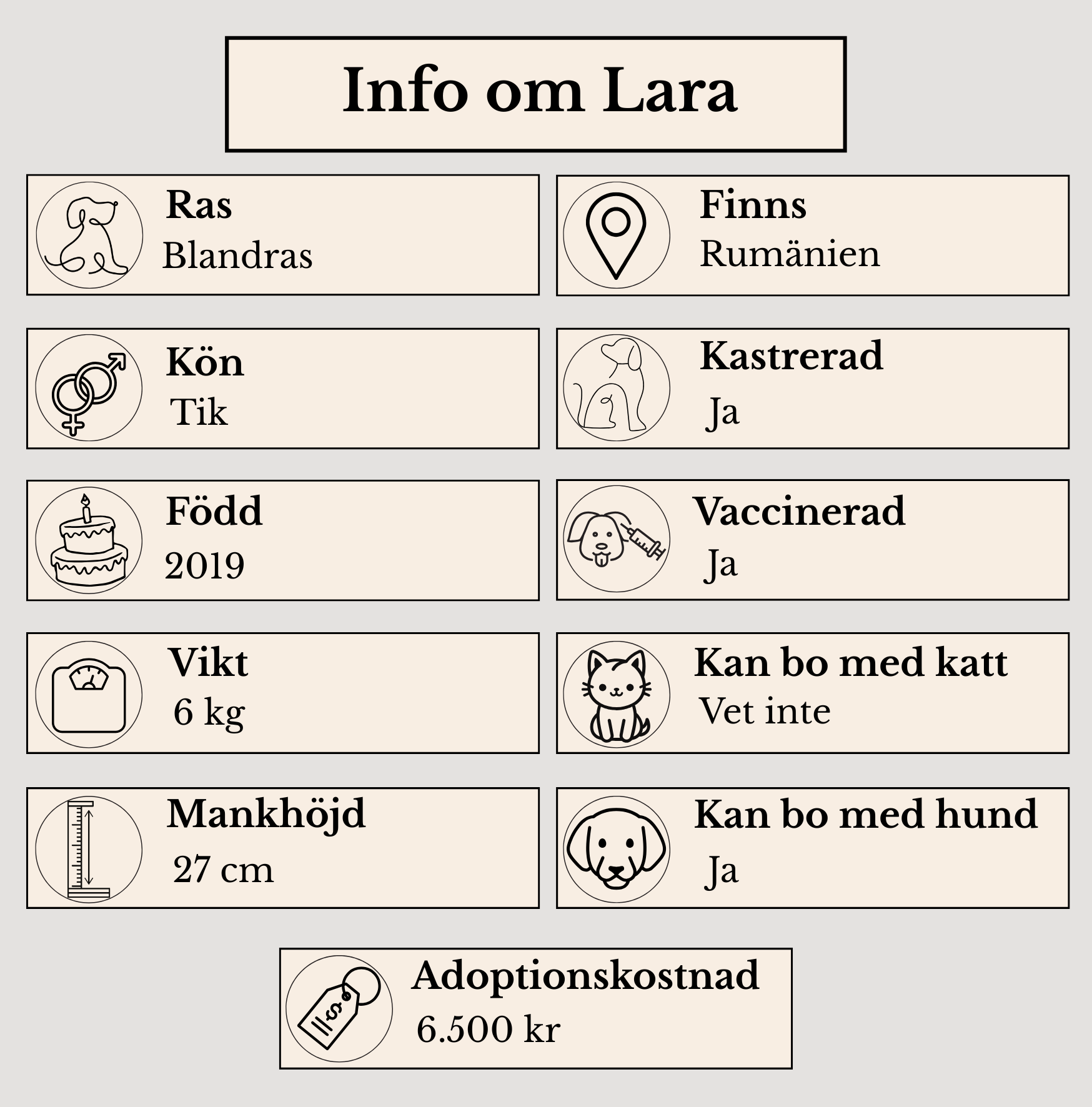 Familjen som tar emot Lara kommer överösas med kärlek. Hon söker en trygg och närvarande familj som vill visa henne fortsatt vägen i livet. Lara trivs mycket väl med sköna promenader i skog och mark. Hon är inte främmande för att utforska nya miljöer, tvärtom. Lara är artig i mötet med andra hundar och har gärna sällskap i vardagen av annan trevlig hund. Hon skulle även trivas som ensamhund. Lara går okej i koppel men behöver mer färdighet.