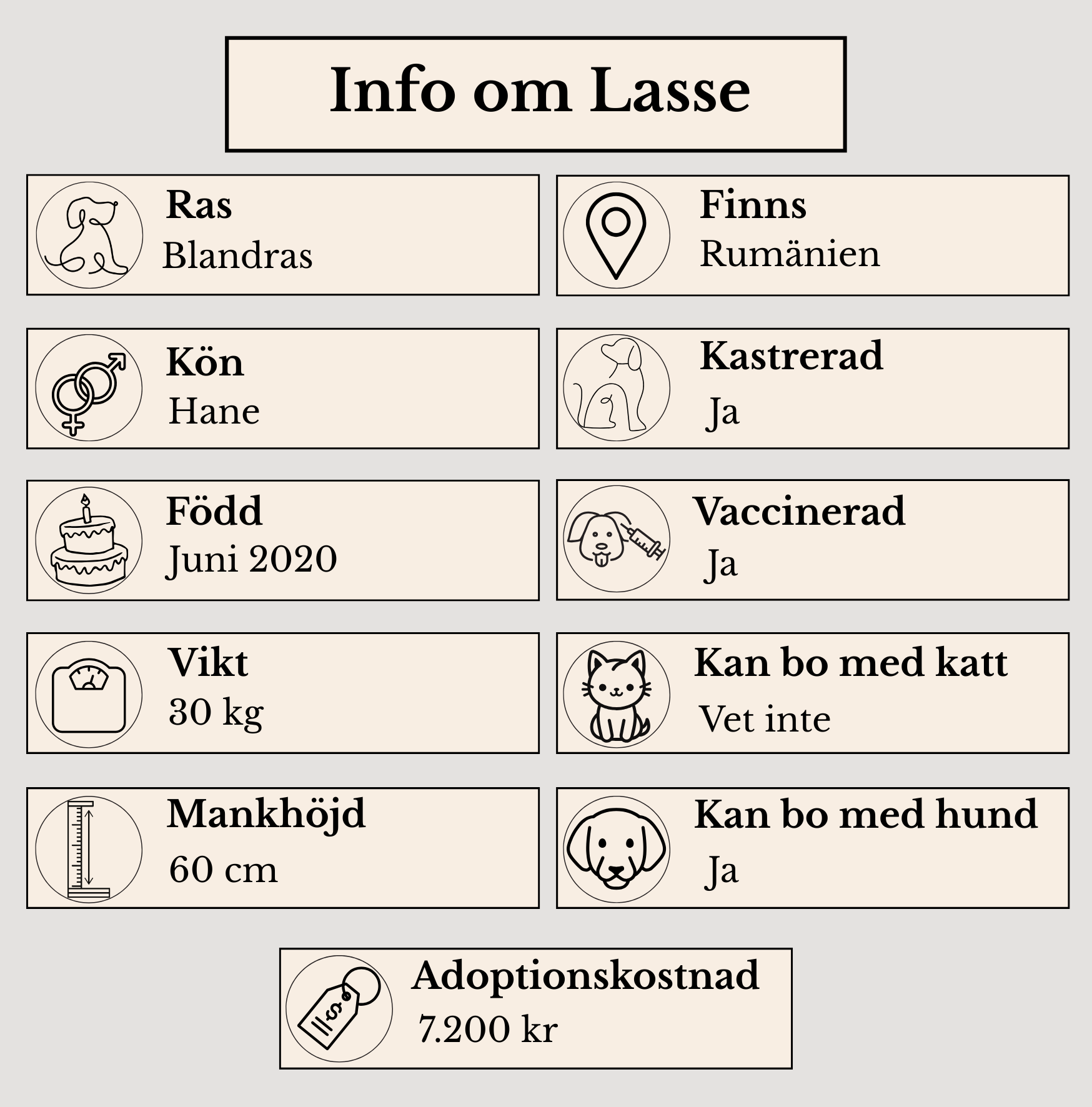 Till Lasse söker vi efter en familj som vill ta med han i vardagen. Han följer dig gärna på långa promenader, en tur i spåret, en fika vid sjön. Lasse har ett öppet sinne och vi är övertygade om att han skulle trivas av att bara få följa med. Han låter sig snällt hanteras i all form. Lasse visar upp en trygg och modig sida även i nya situationer. Han skulle gärna ta ut sig ordentligt genom att springa fritt och utforska i rastgården tillsammans med en hundvän men så även på egen hand.