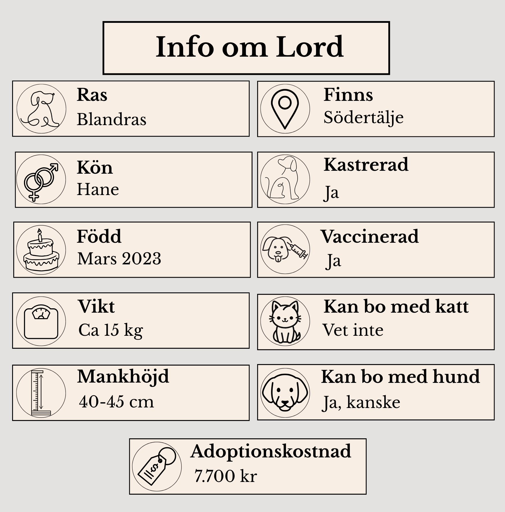 Lord har ett hjärta av guld. Hans givmildhet saknar gräns. Lord möter människor med vänlighet och ömhet. Han är en klok hane som gärna utmanas och får en uppgift. Familjen Lord söker önskar vi ska vara trygg och kärleksfull. Han vill gå ljuvliga promenader i utmanande miljöer. Känna mossan under tassarna, vila gott i sköna gräset. Bara få vara i nuet tillsammans med sin familj.