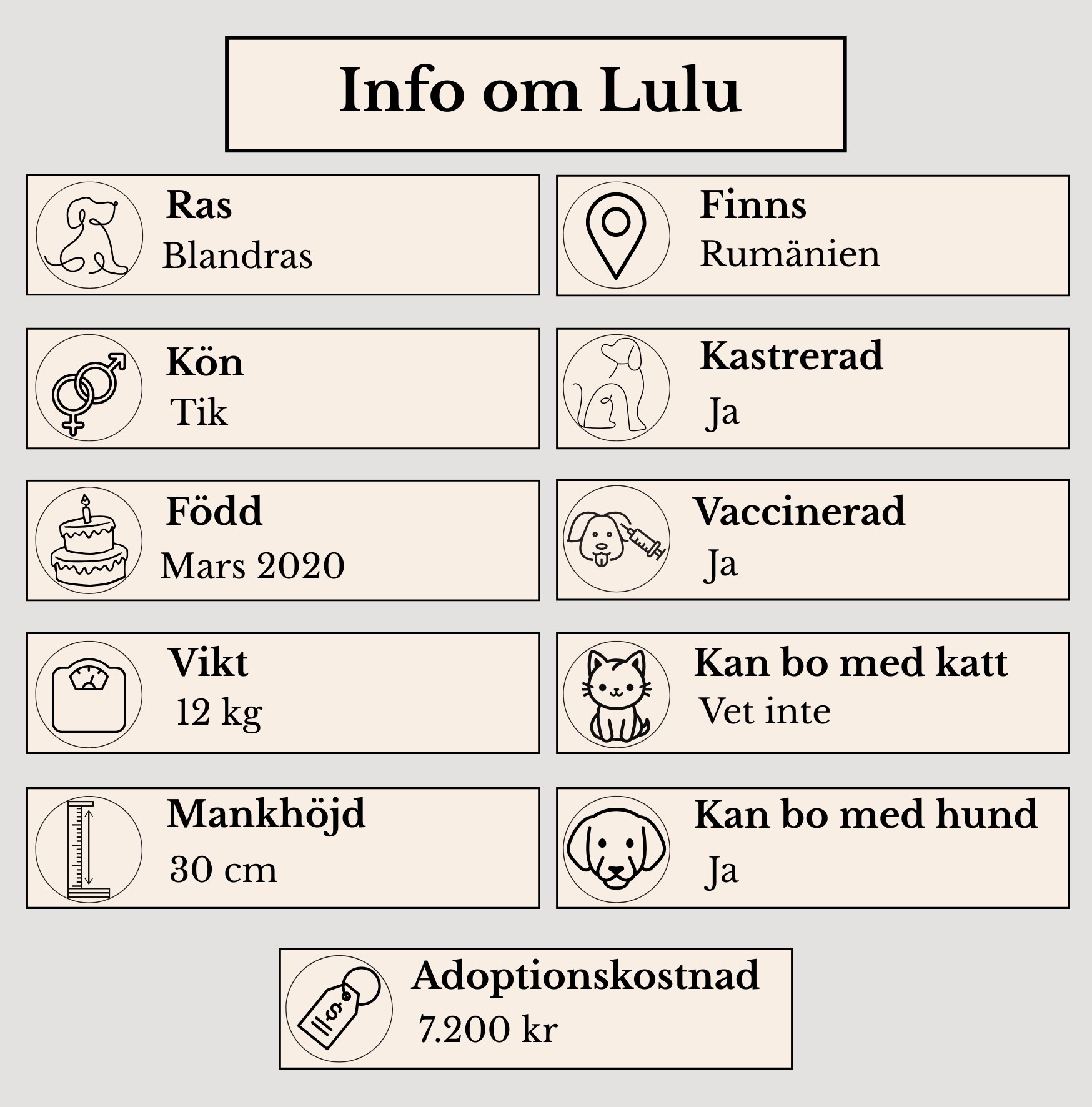 Familjen som tar emot Lulu önskar vi ska vara kärleksfull och tålmodig. Lulu har mycket att ta igen, vardagliga saker som skulle utveckla henne enormt. Hon vill gärna utforska tillsammans med en familj och ta sig an en mer äventyrlig vardag än det hon har idag. Lulu skulle gärna bo tillsammans med annan trevlig hund som kan locka fram lek och bus i henne. Hon önskar få mer träning i koppelgående. Lulu skulle gärna lära sig några tricks eller annan rolig aktivitet.
