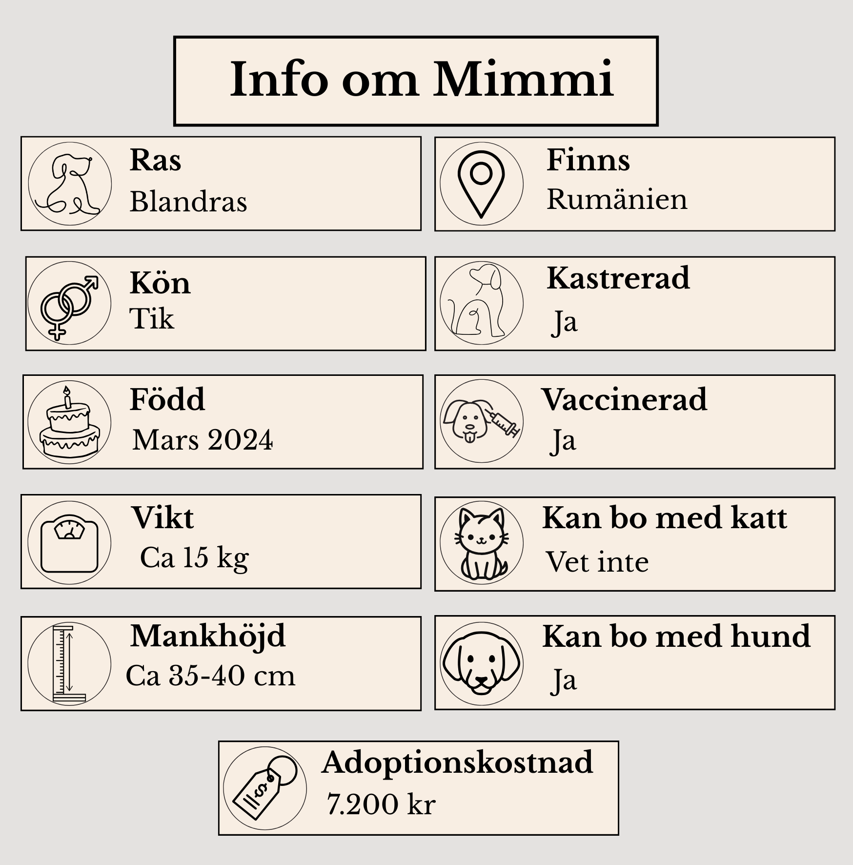 Mimmi söker ett tryggt och kärleksfullt hem där hon får landa, känna sig omhändertagen och äntligen få vara i fokus. Hos rätt familj kommer hon att bli en lojal och öm följeslagare.