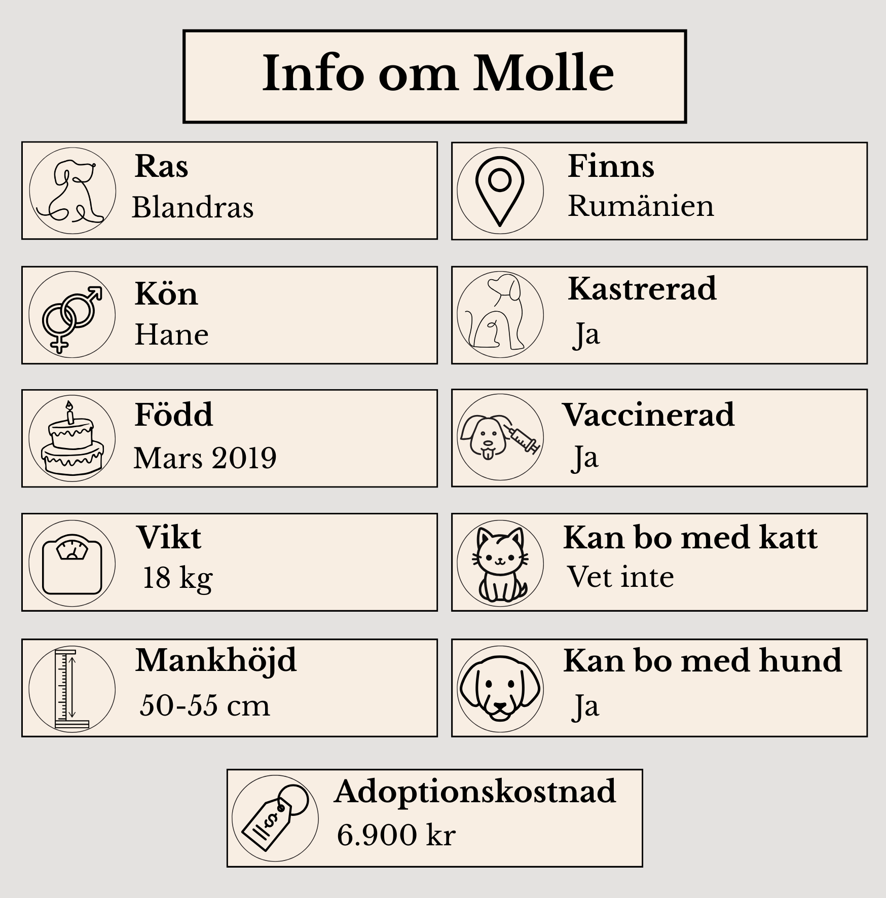 Familjen som adopterar Molle önskar vi ska vara tålmodig och ha en trygg strukturerad vardag. Att vinna Molles förtroende är speciellt. När man får hans tillit är det ett band som är starkt och innerligt som byggs. Molle drömmer om att få njuta av en vardag med kärlek och många nya upplevelser. Sköna promenader där han får utforska i lugn och ro kommer få Molle att blomma. Han trivs väl med andra hundar och skulle med fördel kunna bo med annan trygg hund som kan vara vägledande.