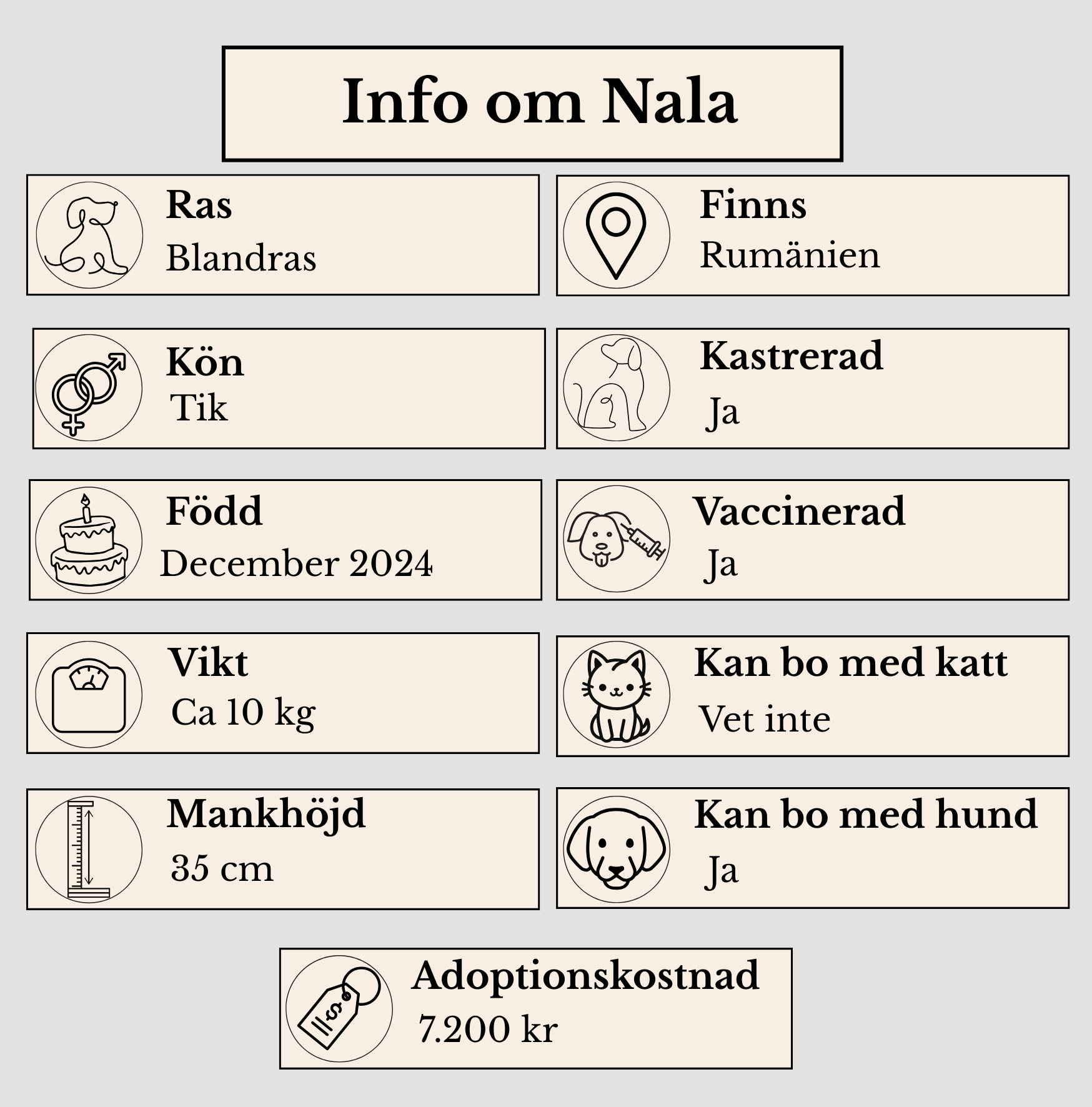 Nala är en tik, beräknad född 2024, som nu söker ett kärleksfullt hem. Hon är lite försiktig till en början, men kommer gärna fram när hon fått känna in situationen. Nala upplevs som en trygg hund med ett mjukt och stabilt sätt.