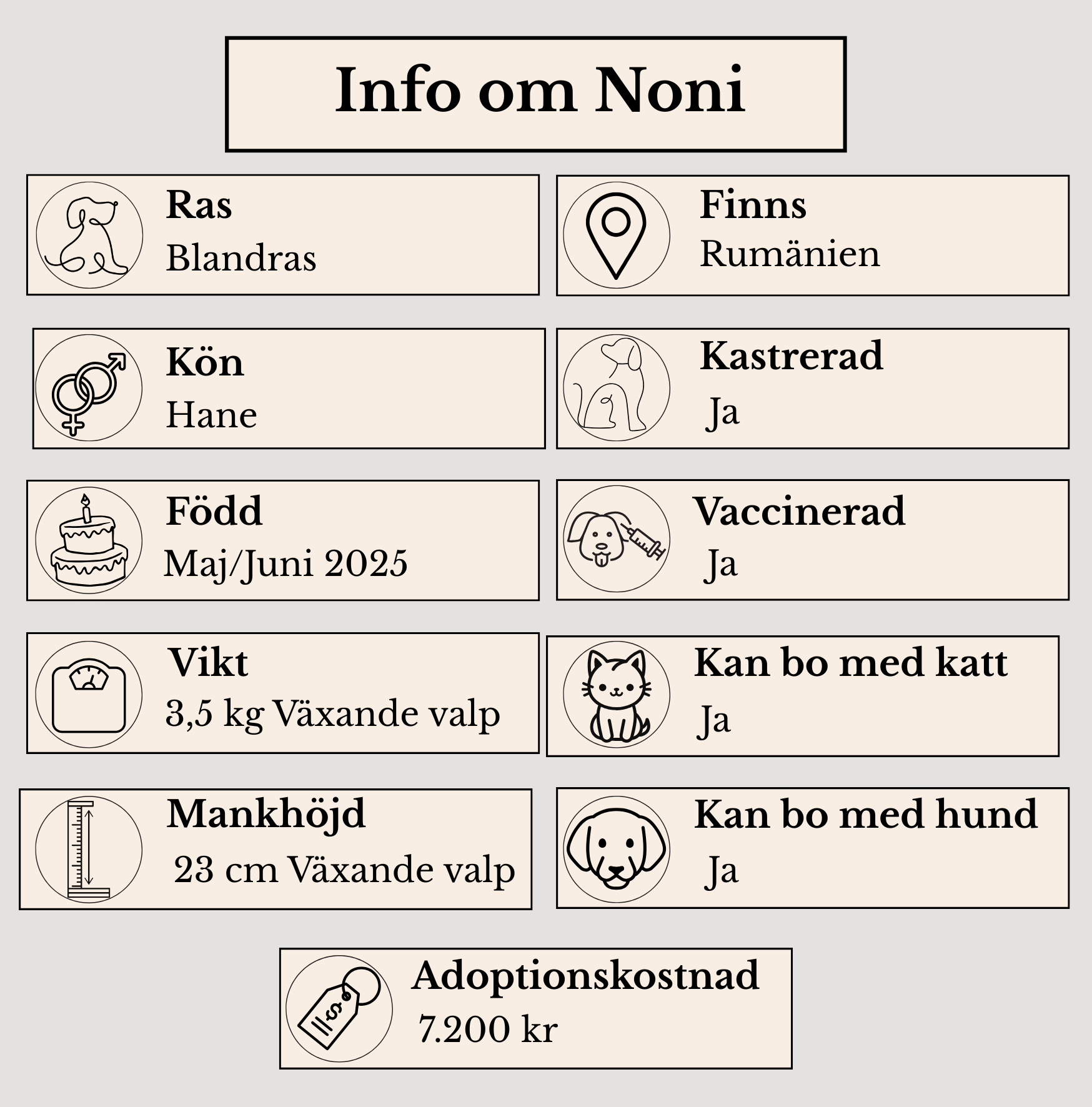 Noni, Chicco och Pino är 3 bröder som nyss har kommit till hägnet. De är lite försiktiga men det släpper fort. De är nyfikna och glada och trivs i varandras tillvaro och tycker om andra hundar. Eftersom livet i hägnet inte är en tillvaro för en valp så ser vi helst att de kommer ifrån hägnet så fort som möjligt. De har då också större möjlighet att utvecklas fortare och bli tryggare.