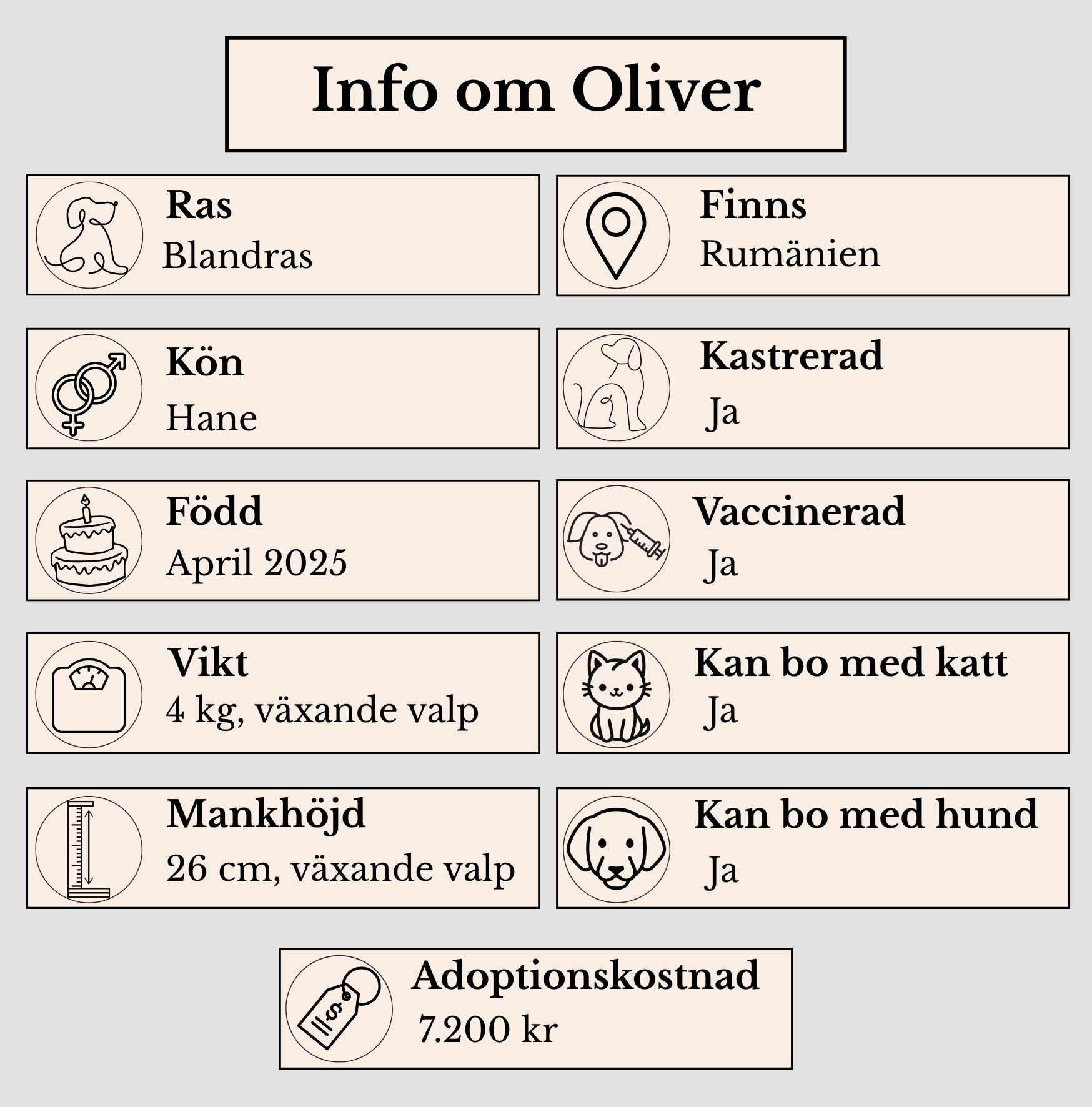 Oliver är vaccinerad, chippad, kommer kastreras innan hemfärd. Han har EU-pass.