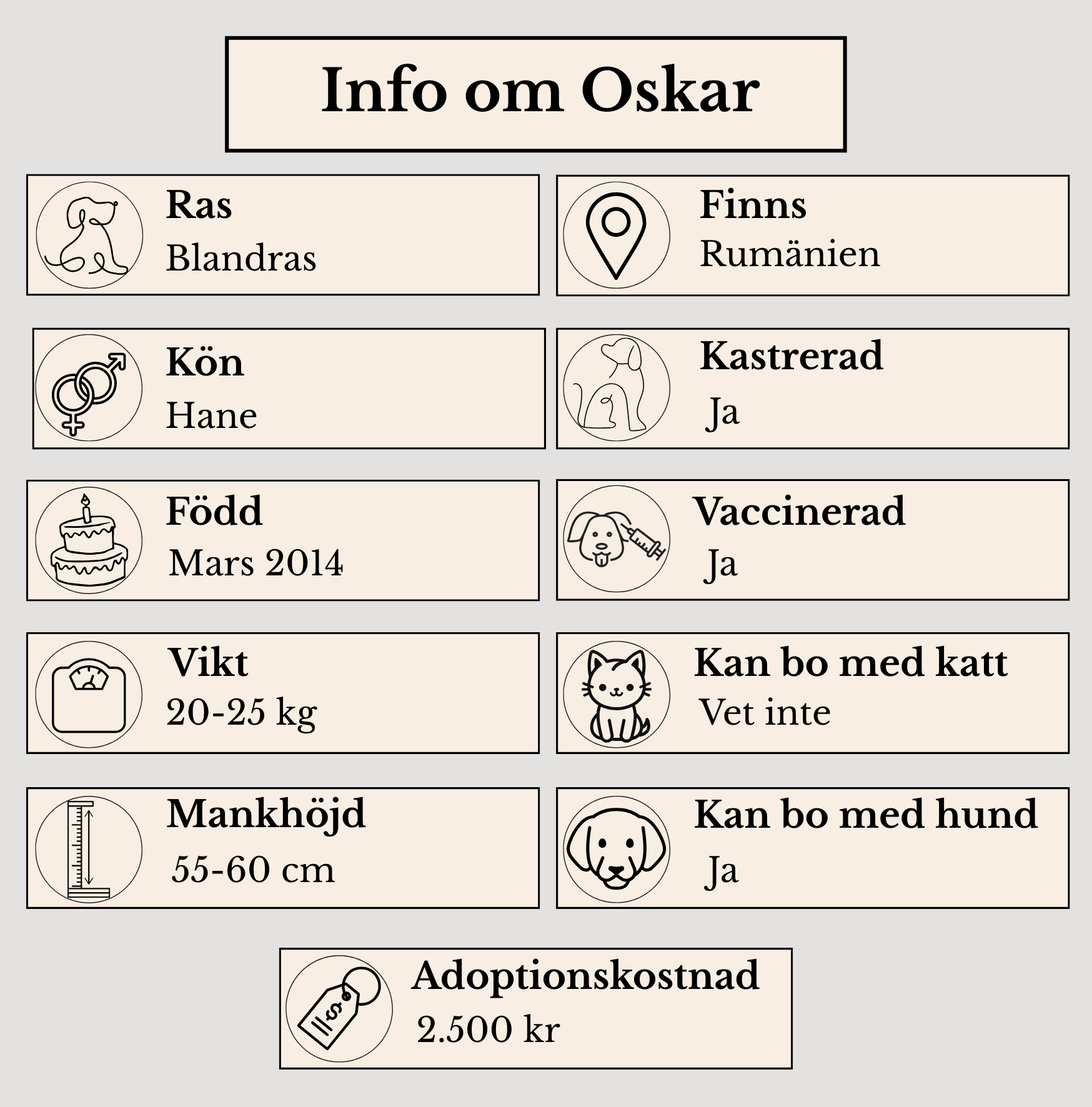 Vi söker en familj som är trygg och tålmodig. Oskar vill få visat för sig allt det han gått miste om i livet. Han vill finna mer mod och bygga en trygg grund att stå på. Tillsammans med en trygg vägledning är det något som kommer gå mycket väl. Oskar är vänlig i mötet med andra hundar och skulle gärna finna en familj där det redan finns en trygg hund som blir hans vän och vägledare. Han tar gärna ljuva promenader tillsammans med sin familj, där han får njuta av nya dofter och miljöer.