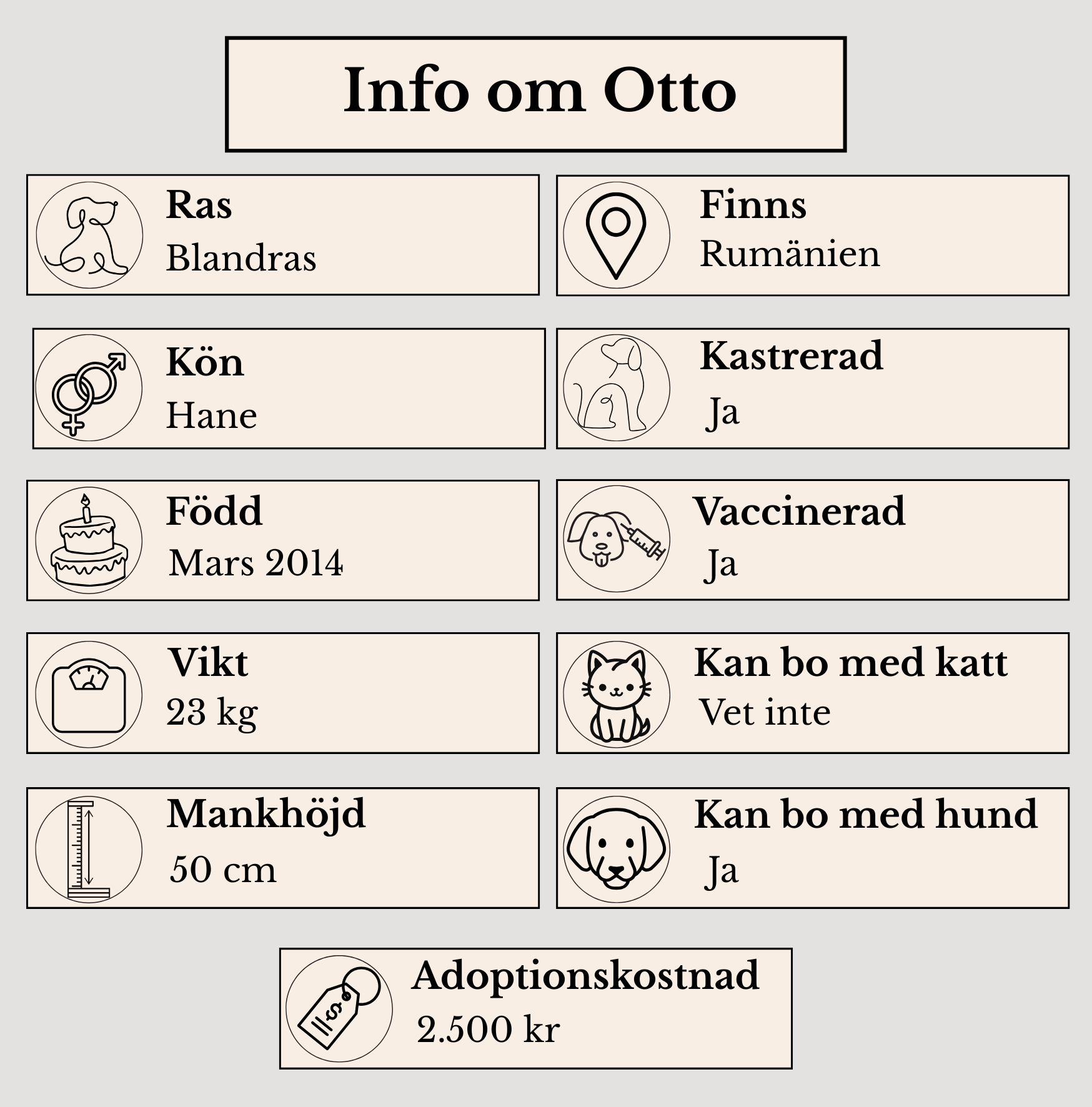 Otto söker en familj som är tålmodig och trygg. Han behöver tydlig struktur för att komma in i en vardag här hemma i Sverige. Otto vill gärna följa med sin kommande familj på smått som stort. Han vill gå fina promenader och bli bättre på koppelgående. Otto behöver med hjälp av sin familj bygga självförtroende och mod. Vi ser stor potential i Otto, han skulle bli en magisk familjemedlem.