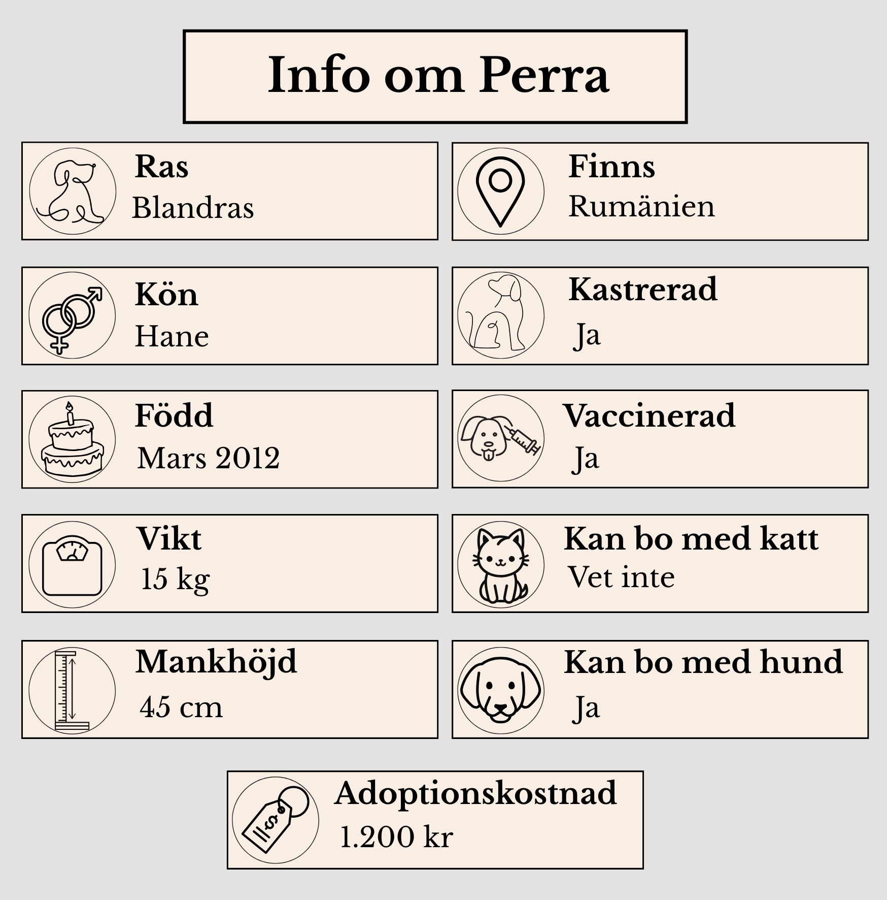 Perra söker en trygg och harmonisk familj som vill dela mysiga stunder tillsammans. Han söker inte längre fart och fläkt. Perra vill gärna krypa nära och kelas med. Sköna promenader i lugn takt och en mjuk bädd att vila i, tillsammans med sin familj. Det är allt vad Perra önskar sig. Tillbaka ger Perra tusenfalt.