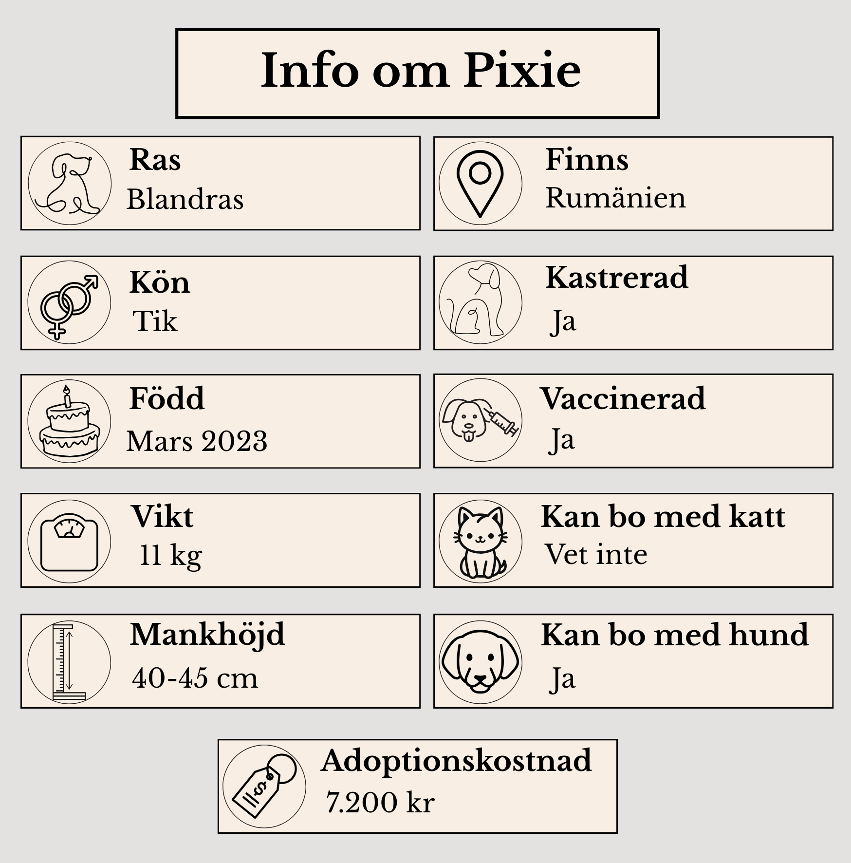 Familjen som tar emot Pixie önskar vi ska utveckla henne till nya höjder. Vi önskar att hon ska få chans att bli en tryggare individ. Pixie skulle stormtrivas av att få uppleva och upptäcka nya miljöer. Vi önskar att familjen som öppnar sitt hem ska vara trygg och tålmodig. Pixie trivs väl med andra hundar och skulle gärna bo tillsammans med annan hund som kan visa henne vägen i allt nytt som komma skall. Hon behöver träna på att gå i koppel.