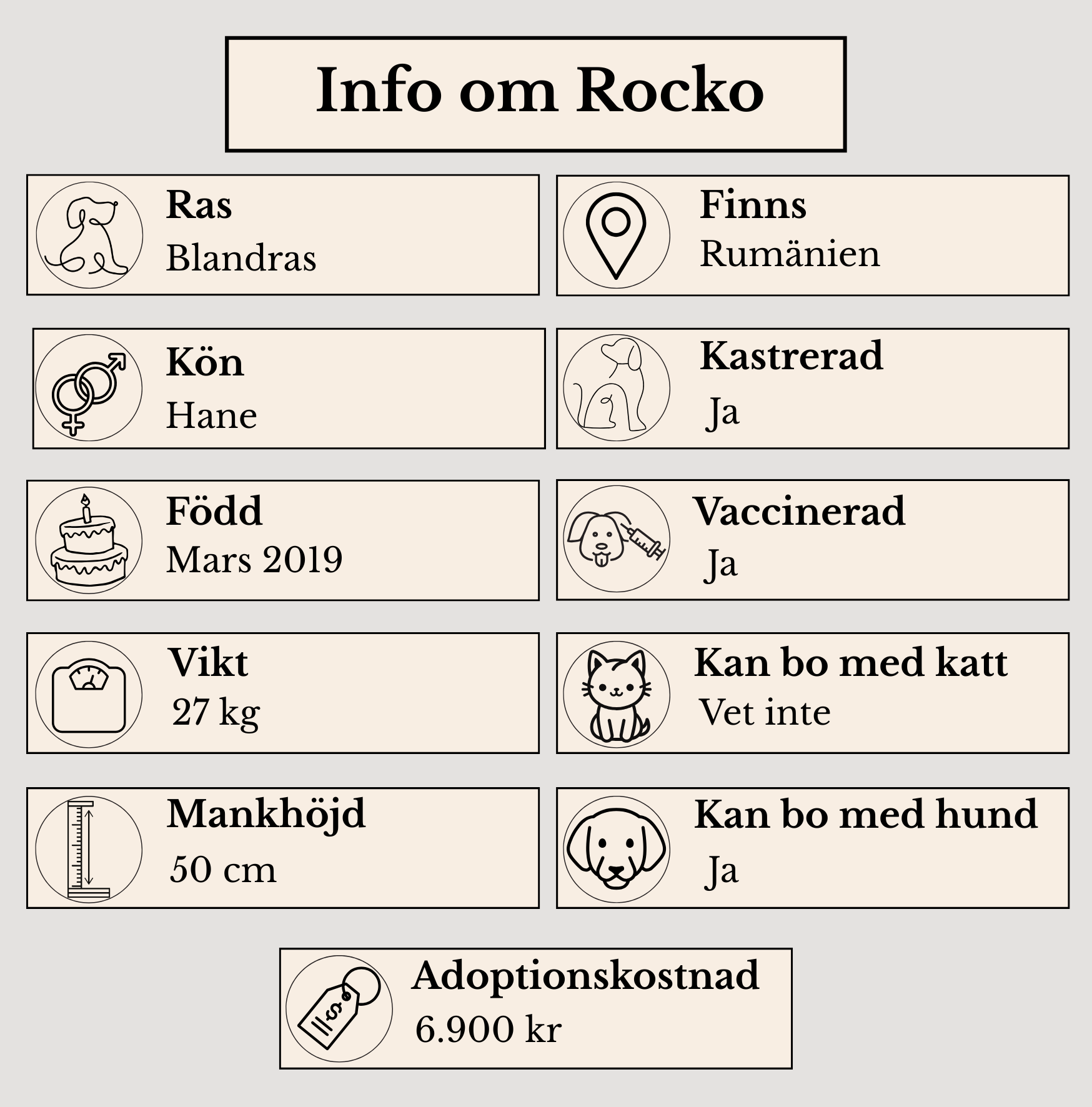 Till Rocko söker vi en strukturerad familj som har en portion tålamod. Det är viktigt att förstå hans bakgrund och avsaknaden av händelser i livet. Rocko vill ta långa promenader i utvecklande miljöer och gärna utforska rastgårdar. Han vill få vara en självklar del av en familj och dess vardag. Framför allt är det viktigt att Rocko får bygga en trygg och stabil grund att stå på. Han är artig i mötet med andra hundar och trivs väl i sällskap. Rocko har god koppelvana.
