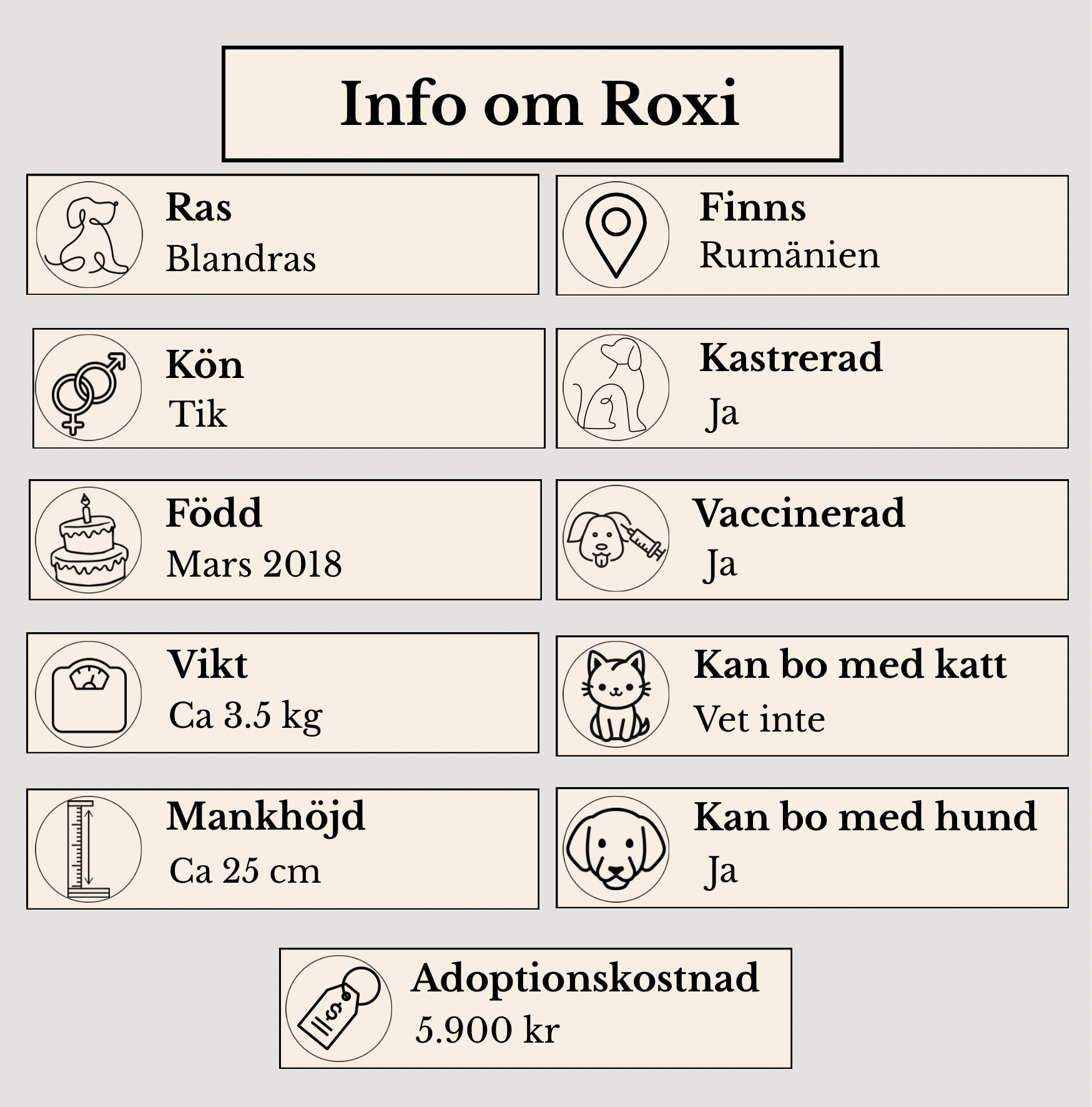Till en början kan Roxi vara lite försiktig i nya situationer, men när hon får uppleva trygghet och kärlek släpper det och hennes fina personlighet kommer fram. Hon söker ett hem där hon får känna stabilitet, omtanke och bli en självklar del av familjen.