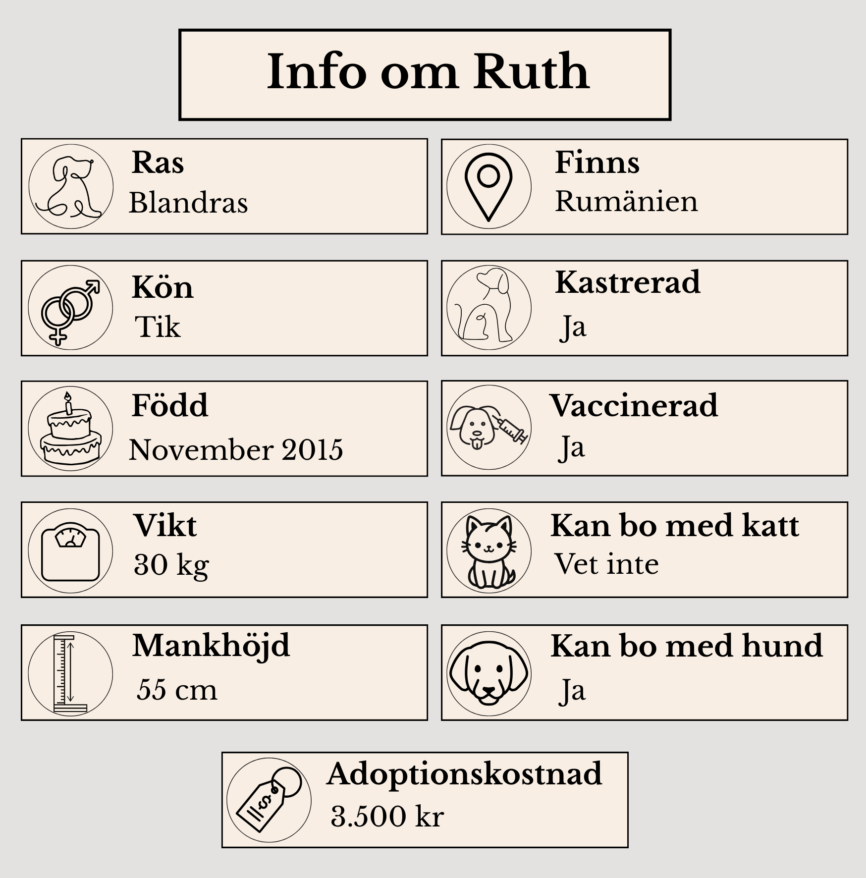 Ruth kommer fram och hälsar. Hon vill gärna vara nära för gos och klappar. En vardag fylld med kärlek och närvaro är drömscenariot för henne. Hon söker en trygg och stabil familj som kan fortsätta utveckla henne framåt. Vi önskar att hon får bygga självförtroende med vägleding. Ruth går fint i koppel.