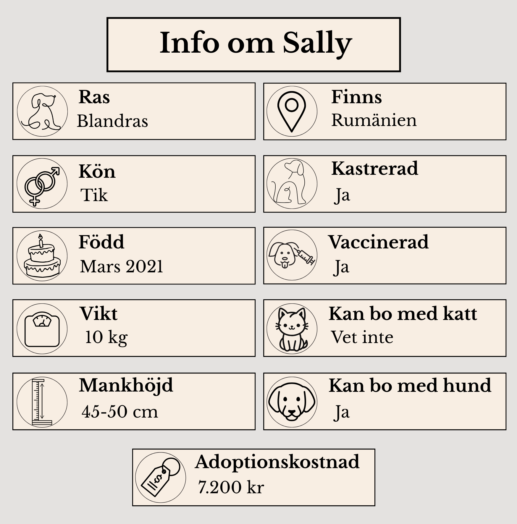 Sally är en rar och trevlig tik som än inte fått se mycket av världen. Hennes hjärta är fyllt till bredden av värme och omtanke. Sally har mött människor som inte alltid haft goda intentioner. Det har gjort att hon är försiktigt inställd till människan. Sally vill gärna våga lita och finna mod men stundom sviker självförtroendet.