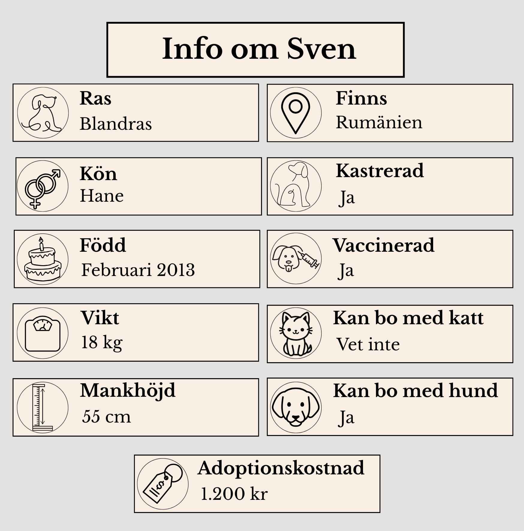 Sven är en hane som beräknas vara född 2013. Han är inte van vid att gå i koppel och upplever detta som mycket obehagligt i nuläget. I mötet med människor är Sven försiktig och viker gärna undan när han blir osäker, men han är snäll och låter sig hanteras utan problem.