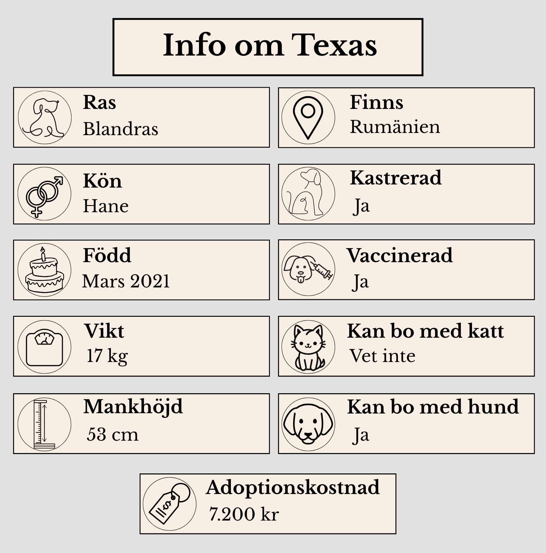 Texas är social och vänlig mot alla han möter, hundar som människor. Han är något underlägsen och har ännu inte fått uppleva så mycket i sitt liv. Det är hög tid att det blir en vändning för Texas så snart som möjligt.