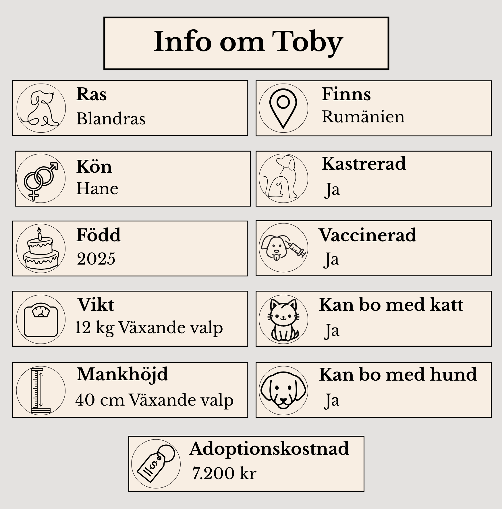 Toby är växande valp och beräknas växa ytterligare och därmed bli stor. Han är vaccinerad, chippad, kastrerad och har EU-pass.